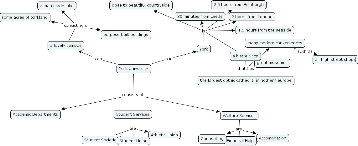 York University consists of Welfare Services, York University consists of Academic Departments, York University consists of Student Services, many modern conveniences such as all high street shops, York is close to beautiful countryside, York is a historic city, York is 2.5 hours from Edinburgh, York is 2 hours from London, York is 1.5 hours from the seaside, York is 30 minutes from Leeds, Student Services are Student Union, Student Services are Student Societies, Student Services are Athletic Union, York University is on a lovely campus, a lovely campus consisting of some acres of parkland, a lovely campus consisting of a man made lake, a lovely campus consisting of purpose built buildings, York University is in York, Welfare Services are Financial Help, Welfare Services are Accomodation, Welfare Services are Counselling, a historic city that has many modern conveniences, a historic city that has great museums, a historic city that has the largest gothic cathedral in nothern europe
