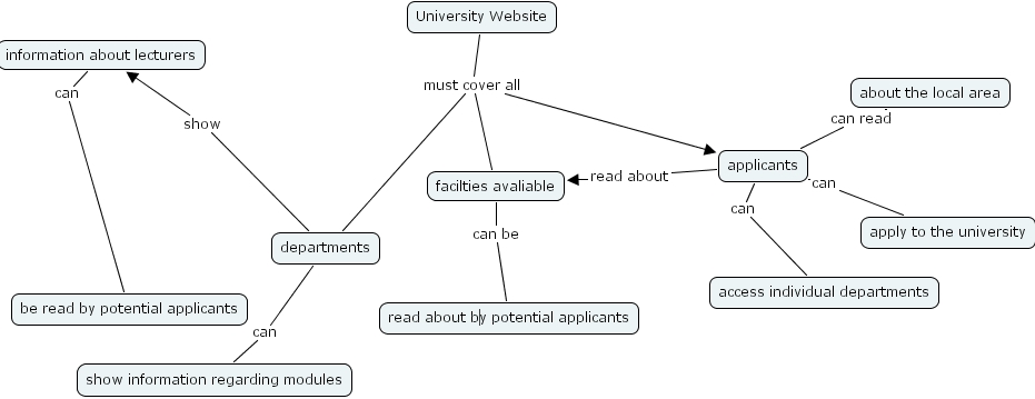 information about lecturers can be read by potential applicants, University Website must cover all departments, University Website must cover all applicants, University Website must cover all facilties avaliable, departments show information about lecturers, applicants can access individual departments, applicants can apply to the university, applicants can read about the local area, departments can show information regarding modules, facilties avaliable can be read about by potential applicants, applicants read about facilties avaliable