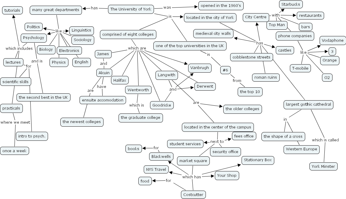 Alcuin are the newest colleges, located in the city of York has roman ruins, located in the city of York has City Centre, located in the city of York has largest gothic cathedral, located in the city of York has cobblestone streets, located in the city of York has medieval city walls, located in the city of York has castles, market square which has NYS Travel, market square which has Costcutter, market square which has Blackwells, market square which has Your Shop, market square which has Stationary Box, largest gothic cathedral in Western Europe, largest gothic cathedral in the shape of a cross, one of the top universities in the UK is #6, practicals where we meet once a week, many great departments like Politics, many great departments like Psychology, many great departments like Linguistics, many great departments like English, many great departments like Electronics, many great departments like Physics, many great departments like Biology, many great departments like Sociology, City Centre with restaurants, City Centre with Top Man, City Centre with phone companies, City Centre with Starbucks, City Centre with bars, Alcuin have ensuite accomodation, Psychology which includes tutorials, Psychology which includes practicals, Psychology which includes lectures, James and Alcuin, located in the center of the campus next to student services, located in the center of the campus next to security office, located in the center of the campus next to fees office, located in the center of the campus next to market square, comprised of eight colleges which are Alcuin, comprised of eight colleges which are Langwith, comprised of eight colleges which are Goodricke, comprised of eight colleges which are Derwent, comprised of eight colleges which are Vanbrugh, comprised of eight colleges which are Halifax, comprised of eight colleges which are Wentworth, The University of York was opened in the 1960's, Langwith and Goodricke, Langwith and Derwent, Langwith and Vanbrugh, Wentworth which is the graduate college, phone companies like 3, phone companies like Orange, phone companies like O2, phone companies like Vodaphone, phone companies like T-mobile, Blackwells for books, largest gothic cathedral which is called York Minster, James which are Alcuin, James which are Langwith, James which are Goodricke, James which are Derwent, James which are Vanbrugh, James which are Halifax, James which are Wentworth, Psychology and is the second best in the UK, Langwith are the older colleges, Langwith are located in the center of the campus, Costcutter for food, #6 from the top 10, lectures for intro to psych., lectures for scientific skills, The University of York has many great departments, The University of York is one of the top universities in the UK, The University of York is located in the city of York, The University of York is comprised of eight colleges