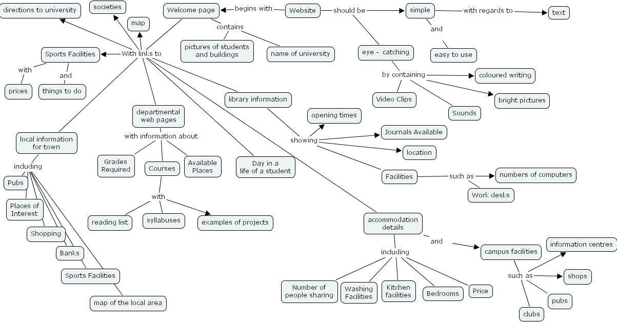 departmental web pages with information about Grades Required, departmental web pages with information about Available Places, departmental web pages with information about Courses, Sports Facilities and things to do, simple with regards to text, Website begins with Welcome page, Facilities such as Work desks, Facilities such as numbers of computers, Sports Facilities with prices, simple and easy to use, Welcome page With links to Day in a life of a student, Welcome page With links to societies, Welcome page With links to Sports Facilities, Welcome page With links to accommodation details, Welcome page With links to departmental web pages, Welcome page With links to map, Welcome page With links to library information, Welcome page With links to local information for town, Welcome page With links to directions to university, accommodation details and campus facilities, campus facilities such as clubs, campus facilities such as shops, campus facilities such as information centres, campus facilities such as pubs, library information showing Journals Available, library information showing opening times, library information showing location, library information showing Facilities, Welcome page contains pictures of students and buildings, Welcome page contains name of university, eye - catching by containing Sounds, eye - catching by containing bright pictures, eye - catching by containing coloured writing, eye - catching by containing Video Clips, Website should be eye - catching, Website should be simple, local information for town including Places of Interest, local information for town including Banks, local information for town including map of the local area, local information for town including Shopping, local information for town including Sports Facilities, local information for town including Pubs, Courses with reading list, Courses with syllabuses, Courses with examples of projects, accommodation details including Number of people sharing, accommodation details including Bedrooms, accommodation details including Price, accommodation details including Kitchen facilities, accommodation details including Washing Facilities