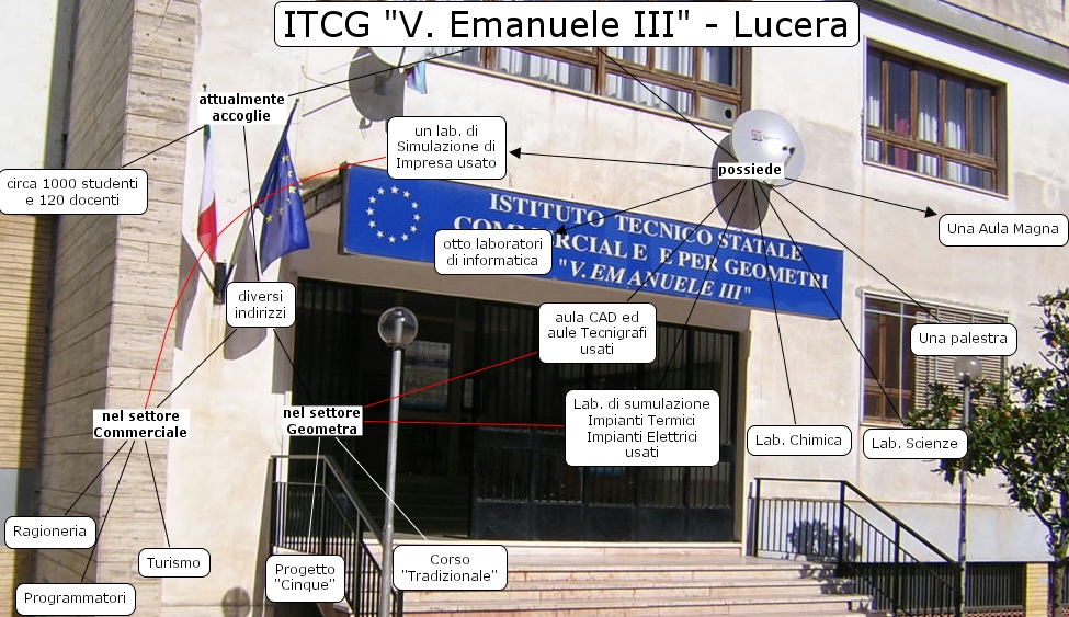 aula CAD ed aule Tecnigrafi usati nel settore Geometra Progetto "Cinque", aula CAD ed aule Tecnigrafi usati nel settore Geometra Corso "Tradizionale", diversi indirizzi nel settore Commerciale Turismo, diversi indirizzi nel settore Commerciale Programmatori, diversi indirizzi nel settore Commerciale Ragioneria, Lab. di sumulazione Impianti Termici Impianti Elettrici usati nel settore Geometra Progetto "Cinque", Lab. di sumulazione Impianti Termici Impianti Elettrici usati nel settore Geometra Corso "Tradizionale", un lab. di Simulazione di Impresa usato nel settore Commerciale Turismo, un lab. di Simulazione di Impresa usato nel settore Commerciale Programmatori, un lab. di Simulazione di Impresa usato nel settore Commerciale Ragioneria, ITCG "V. Emanuele III" - Lucera possiede Lab. Scienze, ITCG "V. Emanuele III" - Lucera possiede otto laboratori di informatica, ITCG "V. Emanuele III" - Lucera possiede Lab. Chimica, ITCG "V. Emanuele III" - Lucera possiede Una Aula Magna, ITCG "V. Emanuele III" - Lucera possiede aula CAD ed aule Tecnigrafi usati, ITCG "V. Emanuele III" - Lucera possiede Lab. di sumulazione Impianti Termici Impianti Elettrici usati, ITCG "V. Emanuele III" - Lucera possiede Una palestra, ITCG "V. Emanuele III" - Lucera possiede un lab. di Simulazione di Impresa usato, diversi indirizzi nel settore Geometra Progetto "Cinque", diversi indirizzi nel settore Geometra Corso "Tradizionale", ITCG "V. Emanuele III" - Lucera attualmente accoglie circa 1000 studenti e 120 docenti, ITCG "V. Emanuele III" - Lucera attualmente accoglie diversi indirizzi
