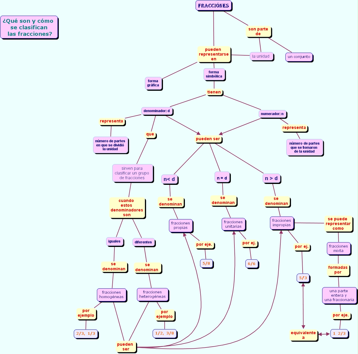 sirven para clasificar un grupo de fracciones cuando estos denominadores son iguales, sirven para clasificar un grupo de fracciones cuando estos denominadores son diferentes, la unidad pueden representarse en forma simb�lica, la unidad pueden representarse en forma gr�fica, denominador: d que sirven para clasificar un grupo de fracciones , n = d se denominan fracciones unitarias, denominador: d pueden ser n< d, denominador: d pueden ser n = d, denominador: d pueden ser n > d, forma simb�lica tienen numerador: n, forma simb�lica tienen denominador: d, iguales se denominan fracciones homog�neas, 5/3 equivalente a 1 2/3, fracciones heterog�neas pueden ser fracciones unitarias, fracciones heterog�neas pueden ser fracciones impropias, fracciones heterog�neas pueden ser fracciones propias, Fracci�nes pueden representarse en forma simb�lica, Fracci�nes pueden representarse en forma gr�fica, fracciones homog�neas pueden ser fracciones unitarias, fracciones homog�neas pueden ser fracciones impropias, fracciones homog�neas pueden ser fracciones propias, fracciones impropias por ej. 5/3, diferentes se denominan fracciones heterog�neas, fracciones heterog�neas por ejemplo 1/2, 3/8, numerador: n pueden ser n< d, numerador: n pueden ser n = d, numerador: n pueden ser n > d, fracciones propias por eje. 5/8, una parte entera y una fraccionaria por eje. 1 2/3, fracciones homog�neas por ejemplo 2/3, 1/3, Fracci�nes son parte de la unidad , Fracci�nes son parte de un conjunto, denominador: d representa n�mero de partes en que se dividi� la unidad, fracciones mixta formadas por una parte entera y una fraccionaria, fracciones impropias se puede representar como fracciones mixta, fracciones unitarias por ej. 6/6, n > d se denominan fracciones impropias, n< d se denominan fracciones propias, numerador: n representa n�mero de partes que se tomaron de la unidad