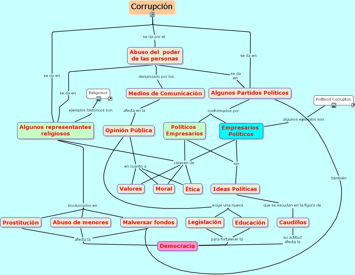 Empresarios Pol�ticos algunos ejemplos son Pol�ticos Corruptos, Opini�n P�blica en cuanto a Valores, Opini�n P�blica en cuanto a Moral, Opini�n P�blica en cuanto a �tica, Algunos representantes religiosos carecen de Valores, Algunos representantes religiosos carecen de Moral, Algunos representantes religiosos carecen de �tica, Corrupci�n se da en Algunos representantes religiosos, Malversar fondos afecta la Democracia, Educaci�n para fortalecer la Democracia, Algunos Partidos Pol�ticos conformados por Empresarios Pol�ticos, Algunos Partidos Pol�ticos conformados por Pol�ticos Empresarios, Corrupci�n se da en Algunos Partidos Pol�ticos, Caudillos su actitud afecta la Democracia, Algunos representantes religiosos involucrados en Malversar fondos, Algunos representantes religiosos involucrados en Abuso de menores, Algunos representantes religiosos involucrados en Prostituci�n, Abuso del poder de las personas se da en Algunos representantes religiosos, Corrupci�n se da por el Abuso del poder de las personas, Algunos Partidos Pol�ticos tambi�n Malversar fondos, Opini�n P�blica exige una nueva Educaci�n, Opini�n P�blica exige una nueva Legislaci�n, Medios de Comunicaci�n afecta en la Opini�n P�blica, Empresarios Pol�ticos sin Ideas Pol�ticas, Abuso del poder de las personas se da en Algunos Partidos Pol�ticos, Pol�ticos Empresarios sin Ideas Pol�ticas, Ideas Pol�ticas que se escudan en la figura de Caudillos, Religiosos ejemplos hist�ricos son Algunos representantes religiosos, Empresarios Pol�ticos carecen de Valores, Empresarios Pol�ticos carecen de Moral, Empresarios Pol�ticos carecen de �tica, Abuso del poder de las personas denunciado por los Medios de Comunicaci�n, Legislaci�n para fortalecer la Democracia, Pol�ticos Empresarios carecen de Valores, Pol�ticos Empresarios carecen de Moral, Pol�ticos Empresarios carecen de �tica, Abuso de menores afecta la Democracia, Prostituci�n afecta la Democracia