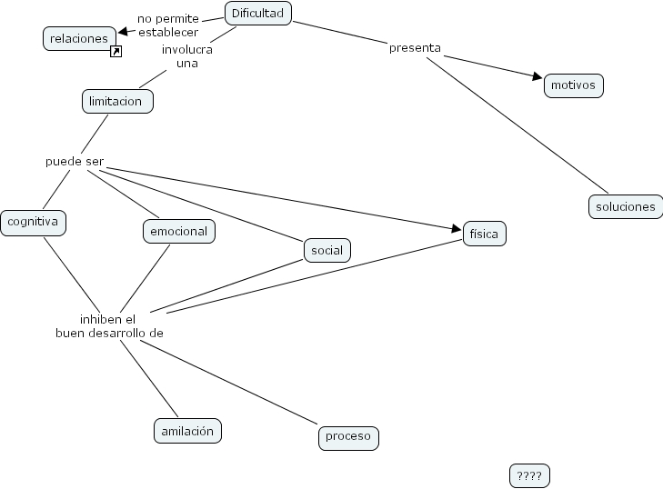 Dificultad presenta soluciones, Dificultad presenta motivos, social inhiben el buen desarrollo de amilaci�n, social inhiben el buen desarrollo de proceso, Dificultad no permite establecer relaciones, cognitiva inhiben el buen desarrollo de amilaci�n, cognitiva inhiben el buen desarrollo de proceso, f�sica inhiben el buen desarrollo de amilaci�n, f�sica inhiben el buen desarrollo de proceso, Dificultad involucra una limitacion , limitacion puede ser emocional, limitacion puede ser cognitiva, limitacion puede ser social, limitacion puede ser f�sica, emocional inhiben el buen desarrollo de amilaci�n, emocional inhiben el buen desarrollo de proceso