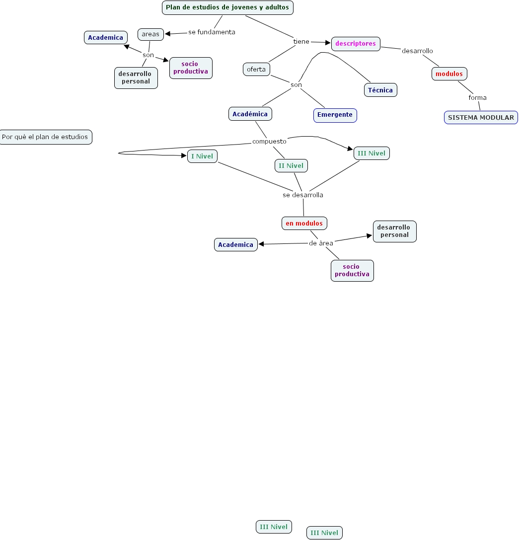 III Nivel se desarrolla en modulos, oferta son Emergente, oferta son T�cnica, oferta son Acad�mica, en modulos de �rea Academica, en modulos de �rea socio productiva, en modulos de �rea desarrollo personal, Acad�mica compuesto II Nivel, Acad�mica compuesto III Nivel, Acad�mica compuesto I Nivel, Plan de estudios de jovenes y adultos se fundamenta areas, modulos forma SISTEMA MODULAR, descriptores desarrollo modulos, I Nivel se desarrolla en modulos, Plan de estudios de jovenes y adultos tiene oferta, Plan de estudios de jovenes y adultos tiene descriptores, II Nivel se desarrolla en modulos, areas son desarrollo personal, areas son Academica, areas son socio productiva