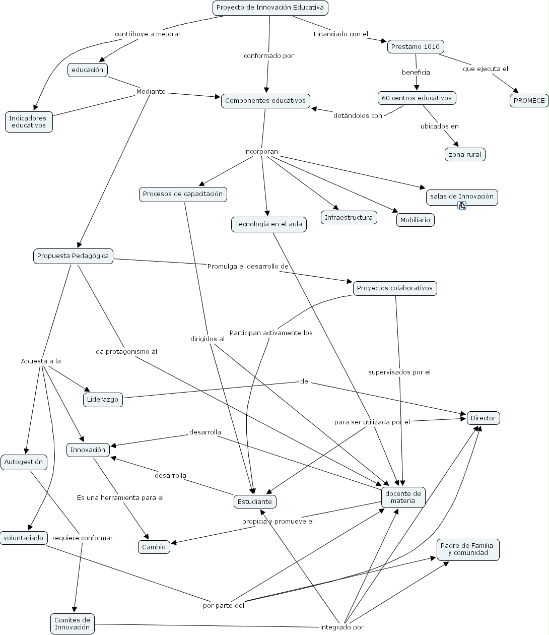 educaci�n Mediante Propuesta Pedag�gica, educaci�n Mediante Componentes educativos, Procesos de capacitaci�n dirigidos al docente de materia, Procesos de capacitaci�n dirigidos al Estudiante, docente de materia desarrolla Innovaci�n, Proyectos colaborativos supervisados por el docente de materia, 60 centros educativos dot�ndolos con Componentes educativos, docente de materia propicia y promueve el Cambio, Autogesti�n requiere conformar Comites de Innovaci�n, Proyecto de Innovaci�n Educativa conformado por Componentes educativos, Estudiante desarrolla Innovaci�n, Prestamo 1010 que ejecuta el PROMECE, Indicadores educativos Mediante Propuesta Pedag�gica, Indicadores educativos Mediante Componentes educativos, Proyecto de Innovaci�n Educativa Financiado con el Prestamo 1010, Liderazgo del Director, Propuesta Pedag�gica Apuesta a la Liderazgo, Propuesta Pedag�gica Apuesta a la voluntariado, Propuesta Pedag�gica Apuesta a la Autogesti�n, Propuesta Pedag�gica Apuesta a la Innovaci�n, Innovaci�n Es una herramienta para el Cambio, Tecnolog�a en el aula para ser utilizada por el docente de materia, Tecnolog�a en el aula para ser utilizada por el Estudiante, Tecnolog�a en el aula para ser utilizada por el Director, Proyectos colaborativos Participan activamente los Estudiante, Proyecto de Innovaci�n Educativa contribuye a mejorar educaci�n, Proyecto de Innovaci�n Educativa contribuye a mejorar Indicadores educativos, Propuesta Pedag�gica da protagonismo al docente de materia, Componentes educativos incorporan Tecnolog�a en el aula, Componentes educativos incorporan Mobiliario, Componentes educativos incorporan Infraestructura, Componentes educativos incorporan Procesos de capacitaci�n, Componentes educativos incorporan salas de Innovaci�n, Prestamo 1010 beneficia 60 centros educativos, voluntariado por parte del docente de materia, voluntariado por parte del Padre de Familia y comunidad, voluntariado por parte del Director, Propuesta Pedag�gica Promulga el desarrollo de Proyectos colaborativos, Comites de Innovaci�n integrado por docente de materia, Comites de Innovaci�n integrado por Estudiante, Comites de Innovaci�n integrado por Director, Comites de Innovaci�n integrado por Padre de Familia y comunidad, 60 centros educativos ubicados en zona rural