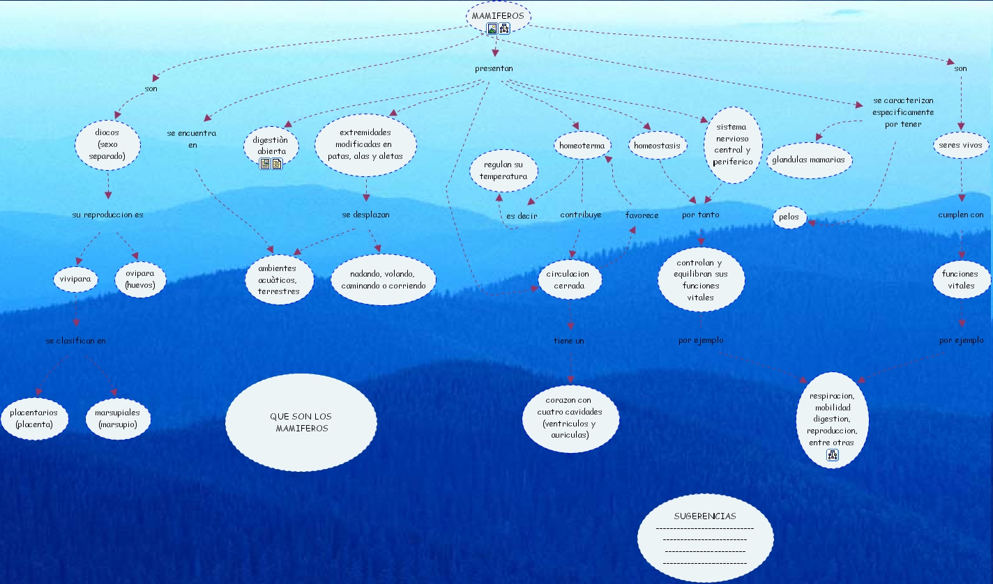 MAMIFEROS son seres vivos, extremidades modificadas en patas, alas y aletas se desplazan nadando, volando, caminando o corriendo, extremidades modificadas en patas, alas y aletas se desplazan ambientes acu�ticos, terrestres, vivipara se clasifican en marsupiales (marsupio), vivipara se clasifican en placentarios (placenta), homeostasis por tanto controlan y equilibran sus funciones vitales, MAMIFEROS se caracterizan especificamente por tener pelos, MAMIFEROS se caracterizan especificamente por tener glandulas mamarias, diocos (sexo separado) su reproduccion es vivipara, diocos (sexo separado) su reproduccion es ovipara (huevos), MAMIFEROS son diocos (sexo separado), circulacion cerrada favorece homeoterma, homeoterma contribuye circulacion cerrada, homeoterma es decir regulan su temperatura, controlan y equilibran sus funciones vitales por ejemplo respiracion, mobilidad digestion, reproduccion, entre otras, seres vivos cumplen con funciones vitales, MAMIFEROS presentan digesti�n abierta, MAMIFEROS presentan extremidades modificadas en patas, alas y aletas, MAMIFEROS presentan sistema nervioso central y periferico, MAMIFEROS presentan homeoterma, MAMIFEROS presentan homeostasis, MAMIFEROS presentan circulacion cerrada, sistema nervioso central y periferico por tanto controlan y equilibran sus funciones vitales, funciones vitales por ejemplo respiracion, mobilidad digestion, reproduccion, entre otras, MAMIFEROS se encuentra en ambientes acu�ticos, terrestres, circulacion cerrada tiene un corazon con cuatro cavidades (ventriculos y auriculas)