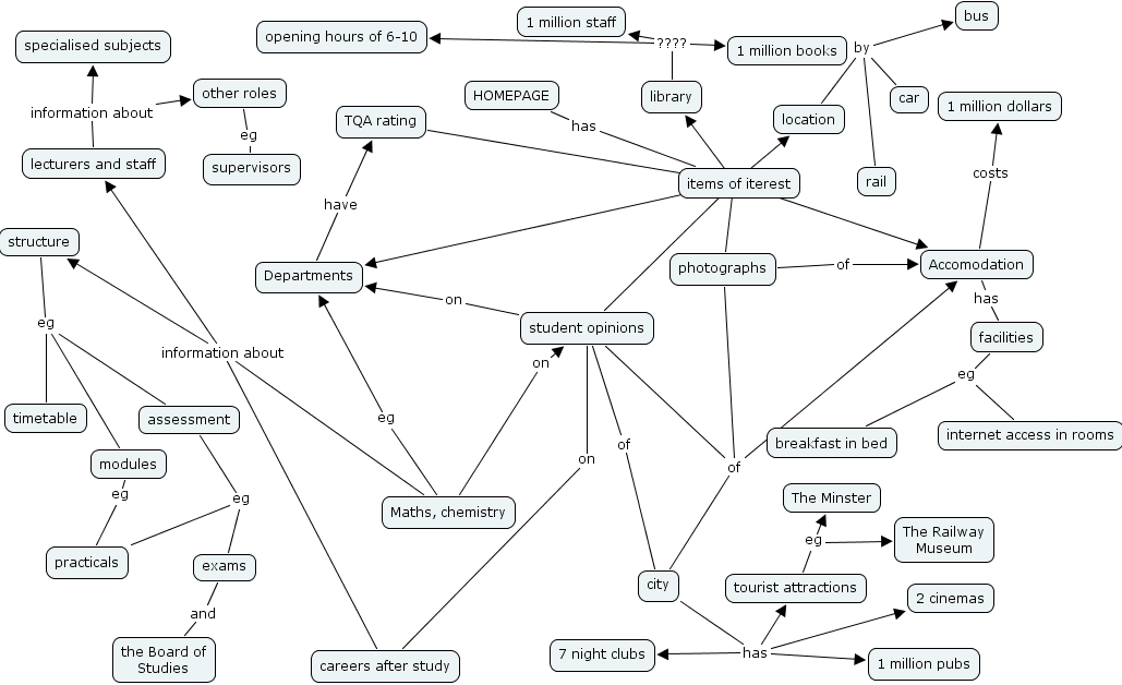 HOMEPAGE has items of iterest, assessment eg practicals, assessment eg exams, student opinions on careers after study, Maths, chemistry on student opinions, photographs of Accomodation, photographs of city, Maths, chemistry information about lecturers and staff, Maths, chemistry information about structure, Maths, chemistry information about careers after study, other roles eg supervisors, Accomodation has facilities, Accomodation costs 1 million dollars, library ???? 1 million books, library ???? 1 million staff, library ???? opening hours of 6-10, lecturers and staff information about specialised subjects, lecturers and staff information about other roles, photographs of Accomodation, structure eg modules, structure eg timetable, structure eg assessment, Maths, chemistry eg Departments, modules eg practicals, facilities eg breakfast in bed, facilities eg internet access in rooms, tourist attractions eg The Minster, tourist attractions eg The Railway Museum, TQA rating Departments, TQA rating library, TQA rating Accomodation, TQA rating student opinions, TQA rating location, TQA rating photographs, student opinions on Departments, student opinions of city, student opinions of Accomodation, student opinions of city, city has 2 cinemas, city has 1 million pubs, city has tourist attractions, city has 7 night clubs, exams and the Board of Studies, Departments have TQA rating, location by car, location by rail, location by bus