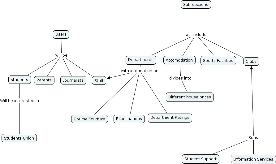 students Will be interested in Students Union, Users will be Parents, Users will be Journalists, Users will be students, Users will be Staff, Accomodation divides into Different house prices, Sub-sections will include Departments, Sub-sections will include Accomodation, Sub-sections will include Clubs, Sub-sections will include Sports Facilities, Students Union Runs Student Support, Students Union Runs Information Services, Students Union Runs Clubs, Departments with information on Department Ratings, Departments with information on Examinations, Departments with information on Staff, Departments with information on Course Stucture
