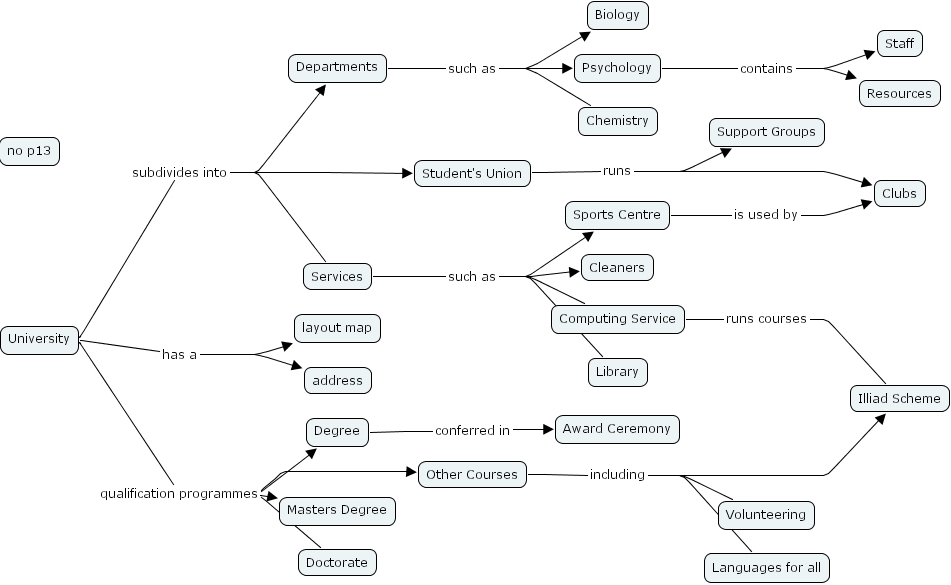 Psychology contains Resources, Psychology contains Staff, Services such as Cleaners, Services such as Library, Services such as Sports Centre, Services such as Computing Service, Departments such as Biology, Departments such as Psychology, Departments such as Chemistry, University subdivides into Services, University subdivides into Departments, University subdivides into Student's Union, University qualification programmes Masters Degree, University qualification programmes Degree, University qualification programmes Doctorate, University qualification programmes Other Courses, Student's Union runs Support Groups, Student's Union runs Clubs, Computing Service runs courses Illiad Scheme, Other Courses including Volunteering, Other Courses including Illiad Scheme, Other Courses including Languages for all, Sports Centre is used by Clubs, Degree conferred in Award Ceremony, University has a layout map, University has a address