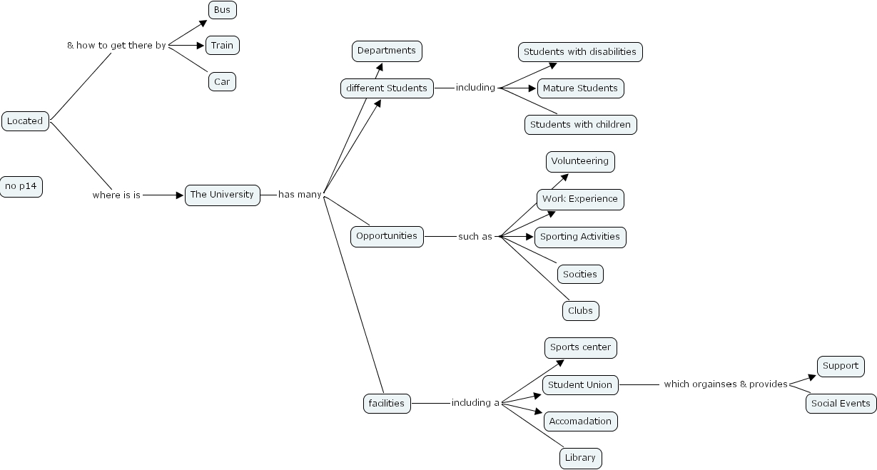 Student Union which orgainses & provides Support, Student Union which orgainses & provides Social Events, The University has many Departments, The University has many facilities, The University has many different Students, The University has many Opportunities, facilities including a Student Union, facilities including a Accomadation, facilities including a Library, facilities including a Sports center, different Students including Students with children, different Students including Students with disabilities, different Students including Mature Students, Opportunities such as Sporting Activities, Opportunities such as Socities, Opportunities such as Volunteering, Opportunities such as Work Experience, Opportunities such as Clubs, Located where is is The University, Located & how to get there by Car, Located & how to get there by Train, Located & how to get there by Bus