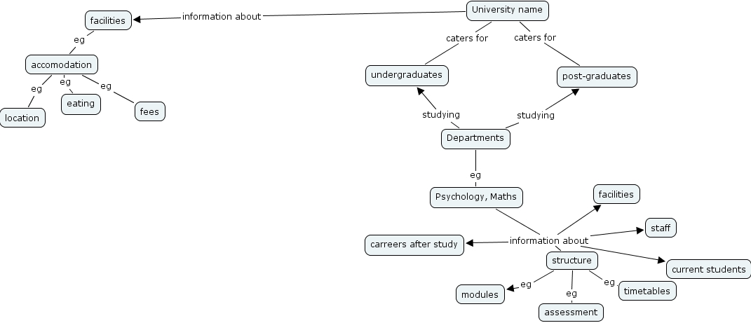 University name caters for undergraduates, University name information about facilities, Departments studying undergraduates, structure eg modules, Departments eg Psychology, Maths, accomodation eg location, accomodation eg fees, Psychology, Maths information about current students, Psychology, Maths information about structure, Psychology, Maths information about facilities, Psychology, Maths information about carreers after study, Psychology, Maths information about staff, University name caters for post-graduates, accomodation eg eating, Departments studying post-graduates, structure eg assessment, facilities eg accomodation, structure eg timetables