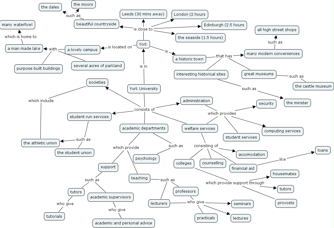 a man made lake which is home to many waterfowl, administration which provides computing services, administration which provides welfare services, administration which provides security, administration which provides student services, a historic town that has interesting historical sites, a historic town that has many modern conveniences, a historic town that has great museums, beautiful countryside such as the dales, beautiful countryside such as the moors, York University consists of student run services, York University consists of welfare services, York University consists of administration, York University consists of academic departments, York University consists of societies, great museums such as the castle museum, colleges which provide support through tutors, colleges which provide support through housemates, colleges which provide support through provosts, York University is in York, support such as tutors, support such as academic supervisors, student run services such as the student union, student run services such as the athletic union, interesting historical sites such as the minster, societies which include the athletic union, York is a historic town, tutors who give tutorials, welfare services consisting of counselling, welfare services consisting of accomodation, welfare services consisting of financial aid, welfare services consisting of colleges, professors who give seminars, professors who give lectures, professors who give practicals, financial aid like loans, academic departments which provide teaching, academic departments which provide support, York is close to beautiful countryside, York is close to London (2 hours, York is close to Edinburgh (2.5 hours, York is close to Leeds (30 mins away), York is close to the seaside (1.5 hours), teaching such as lecturers, teaching such as professors, many modern conveniences such as all high street shops, academic departments such as psychology, academic supervisors who give academic and personal advice, lecturers who give seminars, lecturers who give lectures, lecturers who give practicals, a lovely campus with purpose built buildings, a lovely campus with several acres of parkland, a lovely campus with a man made lake, York is located on a lovely campus