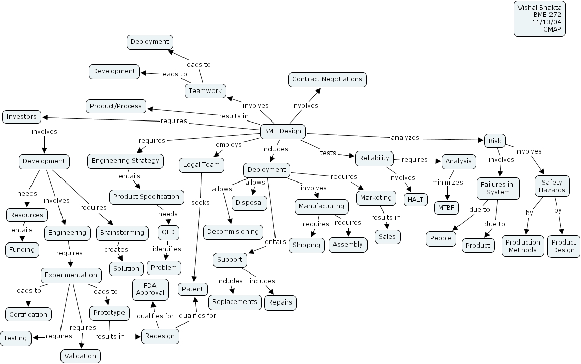 Deployment entails Support, Deployment allows Decommisioning, Development needs Resources, Reliability requires Analysis, Redesign qualifies for FDA Approval, BME Design involves Development, Redesign qualifies for Patent, Teamwork leads to Development, Product Specification needs QFD, Deployment requires Marketing, BME Design results in Product/Process, Manufacturing requires Assembly, Engineering requires Experimentation, Teamwork leads to Deployment, Analysis minimizes MTBF, Brainstorming creates Solution, Experimentation requires Testing, Deployment allows Disposal, Resources entails Funding, Deployment involves Manufacturing, Failures in System due to Product, Experimentation leads to Certification, BME Design involves Contract Negotiations, Experimentation leads to Prototype, Engineering Strategy entails Product Specification, BME Design requires Engineering Strategy, QFD identifies Problem, Support includes Repairs, BME Design analyzes Risk, BME Design tests Reliability, Marketing results in Sales, BME Design includes Deployment, Development requires Brainstorming, Risk involves Failures in System, Development involves Engineering, Manufacturing requires Shipping, Experimentation requires Validation, BME Design employs Legal Team, Safety Hazards by Production Methods, Support includes Replacements, Failures in System due to People, Legal Team seeks Patent, Risk involves Safety Hazards, BME Design involves Teamwork, Safety Hazards by Product Design, Prototype results in Redesign, Reliability involves HALT, BME Design requires Investors