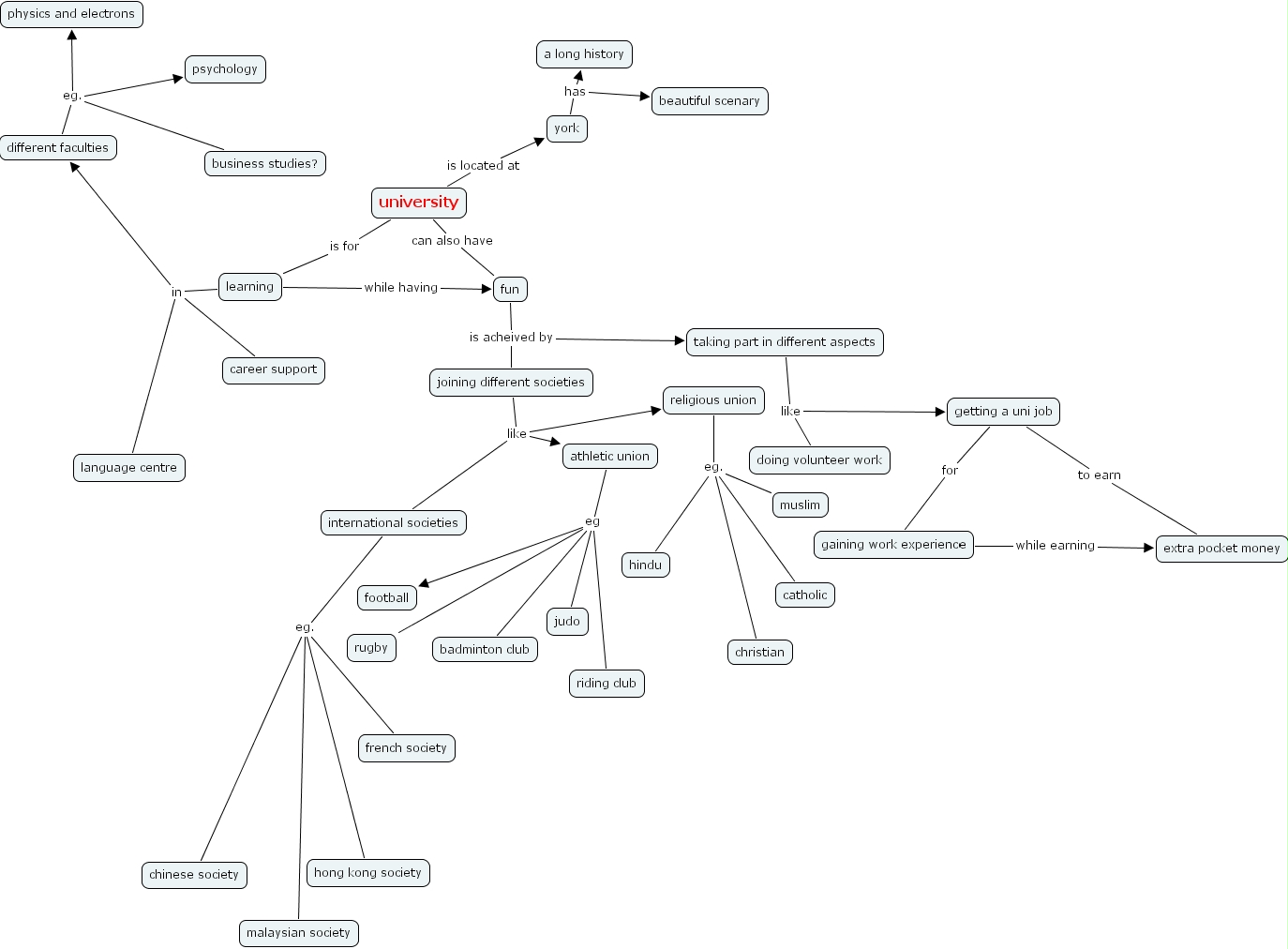 university is located at york, taking part in different aspects like doing volunteer work, taking part in different aspects like getting a uni job, university is for learning, learning while having fun, getting a uni job for gaining work experience, gaining work experience while earning extra pocket money, religious union eg. christian, religious union eg. hindu, religious union eg. catholic, religious union eg. muslim, university can also have fun, learning in language centre, learning in career support, learning in different faculties, different faculties eg. psychology, different faculties eg. physics and electrons, different faculties eg. business studies?, joining different societies like international societies, joining different societies like athletic union, joining different societies like religious union, fun is acheived by taking part in different aspects, fun is acheived by joining different societies, getting a uni job to earn extra pocket money, athletic union eg football, athletic union eg rugby, athletic union eg badminton club, athletic union eg judo, athletic union eg riding club, international societies eg. chinese society, international societies eg. malaysian society, international societies eg. hong kong society, international societies eg. french society, york has a long history, york has beautiful scenary