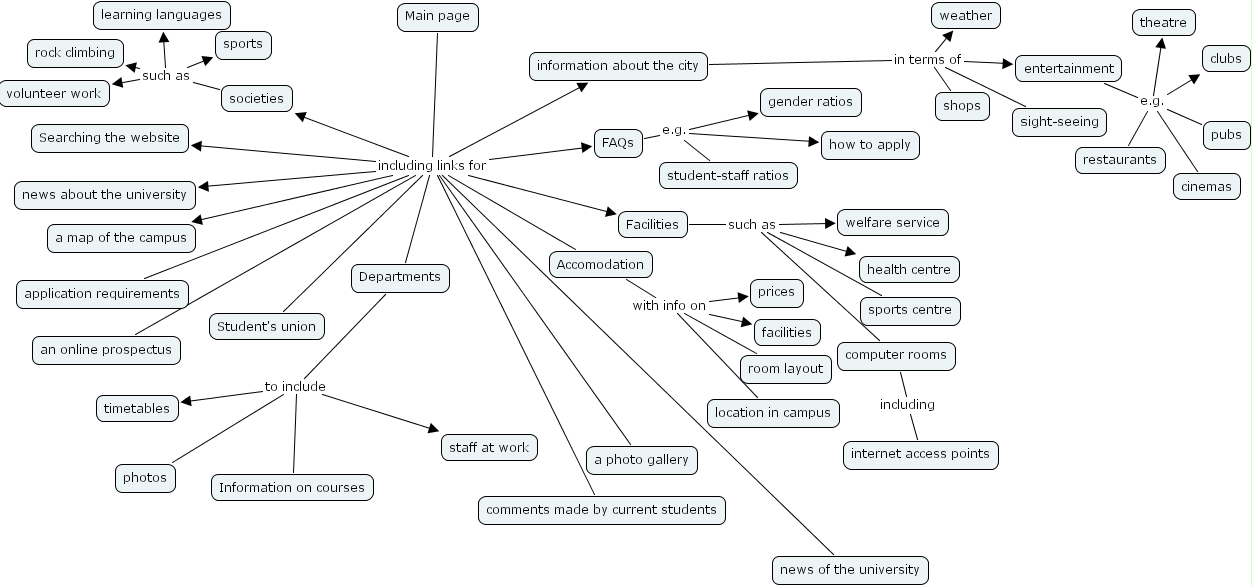 entertainment e.g. pubs, entertainment e.g. restaurants, entertainment e.g. theatre, entertainment e.g. clubs, entertainment e.g. cinemas, societies such as sports, societies such as rock climbing, societies such as learning languages, societies such as volunteer work, FAQs e.g. gender ratios, FAQs e.g. student-staff ratios, FAQs e.g. how to apply, computer rooms including internet access points, information about the city in terms of shops, information about the city in terms of sight-seeing, information about the city in terms of weather, information about the city in terms of entertainment, Main page including links for information about the city, Main page including links for a photo gallery, Main page including links for comments made by current students, Main page including links for Facilities, Main page including links for Searching the website, Main page including links for FAQs, Main page including links for a map of the campus, Main page including links for an online prospectus, Main page including links for Departments, Main page including links for news of the university, Main page including links for Student's union, Main page including links for application requirements, Main page including links for news about the university, Main page including links for Accomodation, Main page including links for societies, Accomodation with info on location in campus, Accomodation with info on facilities, Accomodation with info on prices, Accomodation with info on room layout, Facilities such as welfare service, Facilities such as sports centre, Facilities such as computer rooms, Facilities such as health centre, Departments to include Information on courses, Departments to include staff at work, Departments to include timetables, Departments to include photos