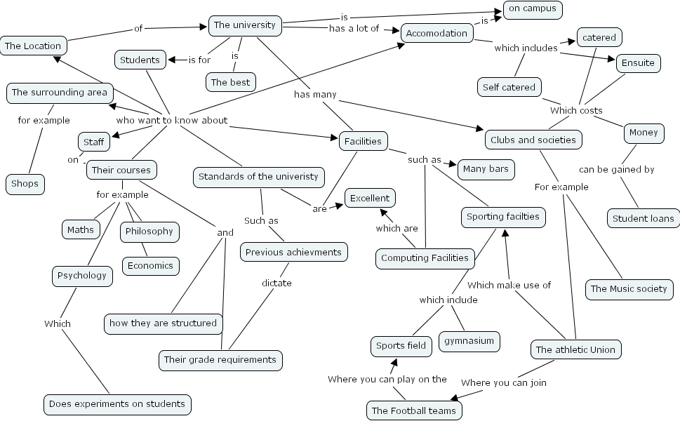 The athletic Union Which make use of Sporting facilties, The Football teams Where you can play on the Sports field, Clubs and societies For example The athletic Union, Clubs and societies For example The Music society, Previous achievments dictate Their grade requirements, Students who want to know about Staff, Students who want to know about Accomodation, Students who want to know about The surrounding area, Students who want to know about Their courses, Students who want to know about Facilities, Students who want to know about The Location, Students who want to know about Standards of the univeristy, Facilities are Excellent, Clubs and societies Which costs Money, Accomodation is on campus, The university is on campus, The athletic Union Where you can join The Football teams, Money can be gained by Student loans, Their courses and Their grade requirements, Their courses and how they are structured, Staff on Their courses, Standards of the univeristy are Excellent, catered Which costs Money, Ensuite Which costs Money, Self catered Which costs Money, Their courses for example Philosophy, Their courses for example Economics, Their courses for example Psychology, Their courses for example Maths, Computing Facilities which are Excellent, The university is for Students, Accomodation which includes Self catered, Accomodation which includes catered, Accomodation which includes Ensuite, Sporting facilties which include Sports field, Sporting facilties which include gymnasium, Facilities such as Many bars, Facilities such as Sporting facilties, Facilities such as Computing Facilities, The university has many Clubs and societies, The university has many Facilities, The surrounding area for example Shops, Psychology Which Does experiments on students, Standards of the univeristy Such as Previous achievments, The university has a lot of Accomodation, The Location of The university, The university is The best
