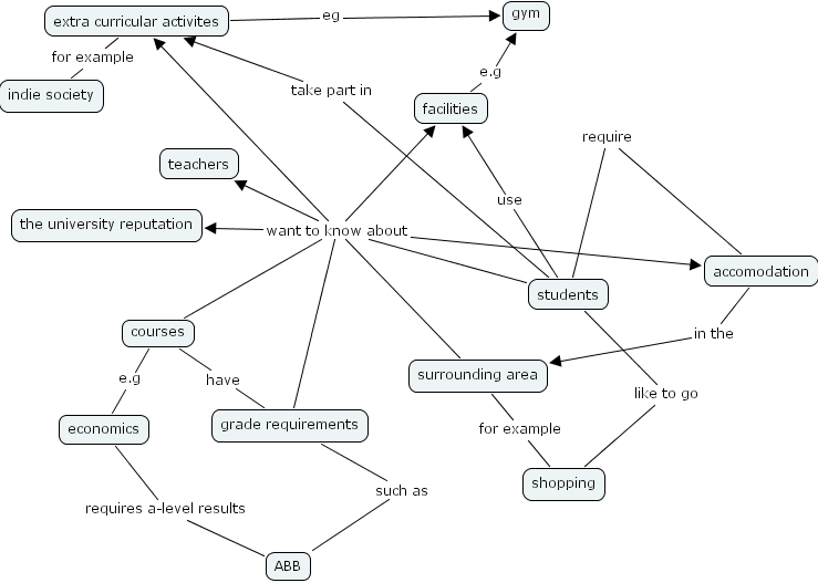extra curricular activites for example indie society, economics requires a-level results ABB, grade requirements such as ABB, extra curricular activites eg gym, students take part in extra curricular activites, courses e.g economics, accomodation in the surrounding area, facilities e.g gym, courses have grade requirements, students use facilities, students require accomodation, students like to go shopping, students want to know about the university reputation, students want to know about grade requirements, students want to know about accomodation, students want to know about surrounding area, students want to know about courses, students want to know about facilities, students want to know about extra curricular activites, students want to know about teachers, surrounding area for example shopping