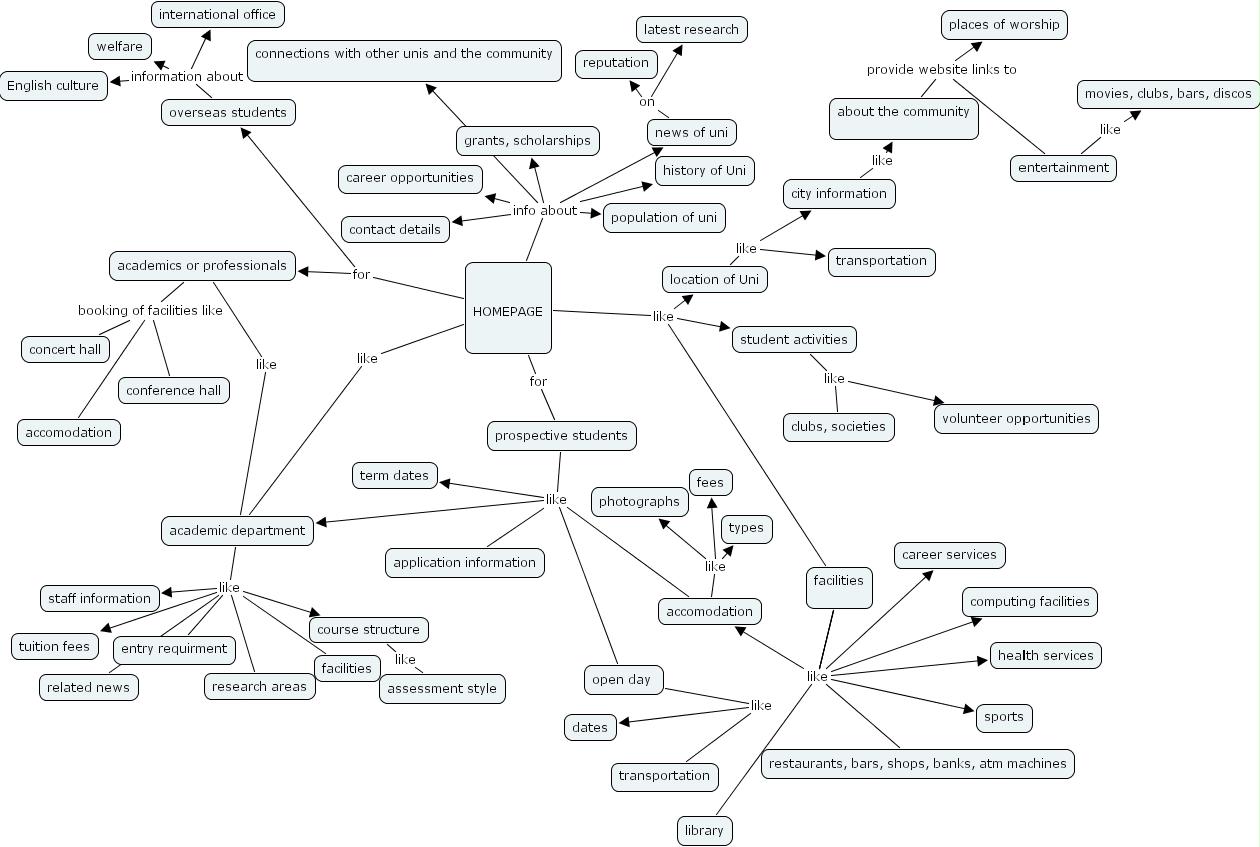 facilities like library, facilities like career services, facilities like accomodation, facilities like health services, facilities like computing facilities, facilities like restaurants, bars, shops, banks, atm machines, facilities like sports, academics or professionals booking of facilities like concert hall, academics or professionals booking of facilities like accomodation, academics or professionals booking of facilities like conference hall, HOMEPAGE for academics or professionals, HOMEPAGE for overseas students, news of uni on reputation, news of uni on latest research, city information like about the community , entertainment like movies, clubs, bars, discos, HOMEPAGE like facilities , HOMEPAGE like location of Uni, HOMEPAGE like student activities, facilities like library, facilities like career services, facilities like accomodation, facilities like health services, facilities like computing facilities, facilities like restaurants, bars, shops, banks, atm machines, facilities like sports, academics or professionals like academic department, accomodation like photographs, accomodation like fees, accomodation like types, HOMEPAGE for prospective students, academic department like course structure, academic department like facilities, academic department like tuition fees, academic department like research areas, academic department like staff information, academic department like related news, academic department like entry requirment, facilities like library, facilities like career services, facilities like accomodation, facilities like health services, facilities like computing facilities, facilities like restaurants, bars, shops, banks, atm machines, facilities like sports, student activities like volunteer opportunities, student activities like clubs, societies, overseas students information about welfare, overseas students information about international office, overseas students information about English culture, HOMEPAGE info about career opportunities, HOMEPAGE info about connections with other unis and the community , HOMEPAGE info about grants, scholarships, HOMEPAGE info about news of uni, HOMEPAGE info about history of Uni, HOMEPAGE info about population of uni, HOMEPAGE info about contact details, HOMEPAGE like academic department, prospective students like accomodation, prospective students like application information, prospective students like academic department, prospective students like term dates, prospective students like open day , location of Uni like transportation, location of Uni like city information, open day like dates, open day like transportation, course structure like assessment style, about the community provide website links to entertainment, about the community provide website links to places of worship