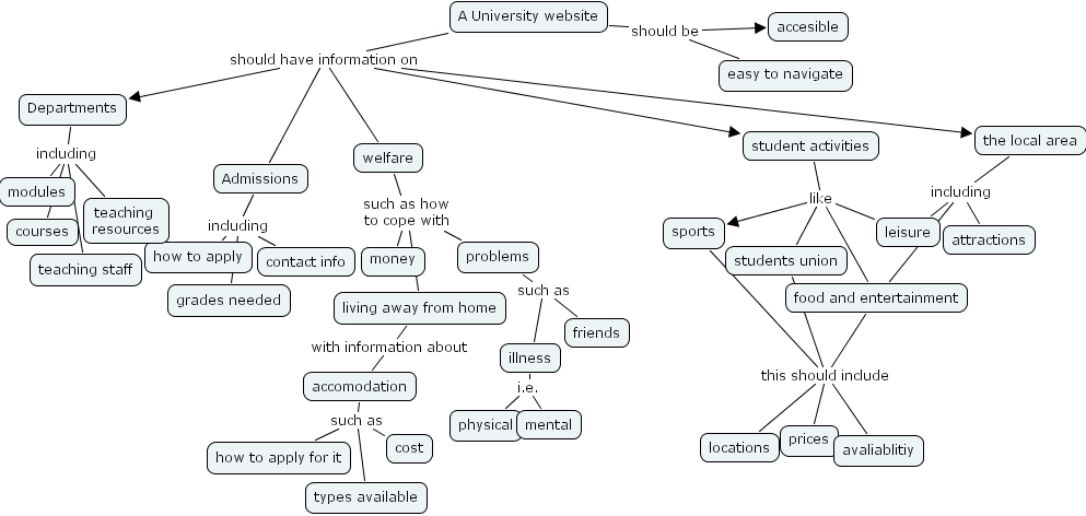 the local area including leisure, the local area including food and entertainment, the local area including attractions, Admissions including grades needed, Admissions including contact info, Admissions including how to apply, sports this should include locations, sports this should include avaliablitiy, welfare such as how to cope with money, welfare such as how to cope with living away from home, welfare such as how to cope with problems, living away from home with information about accomodation, Departments including teaching resources, Departments including teaching staff, Departments including courses, Departments including modules, prices this should include locations, prices this should include avaliablitiy, student activities like students union, student activities like leisure, student activities like sports, student activities like food and entertainment, accomodation such as how to apply for it, accomodation such as types available, accomodation such as cost, A University website should have information on Departments, A University website should have information on welfare, A University website should have information on Admissions, A University website should have information on the local area, A University website should have information on student activities, food and entertainment this should include locations, food and entertainment this should include avaliablitiy, students union this should include locations, students union this should include avaliablitiy, problems such as friends, problems such as illness, illness i.e. physical, illness i.e. mental, A University website should be accesible, A University website should be easy to navigate
