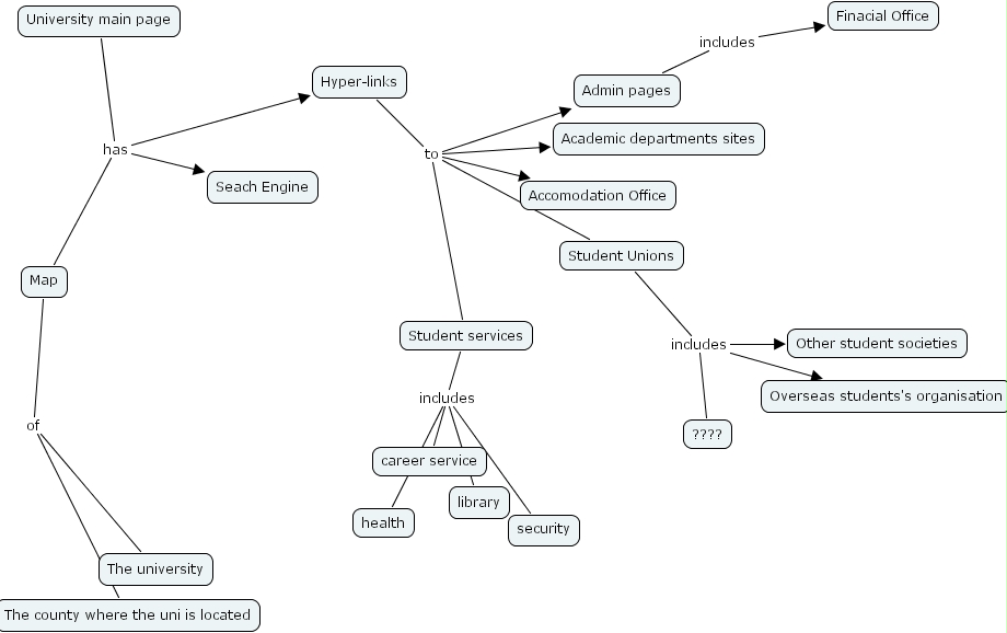Map of The county where the uni is located, Map of The university, University main page has Map, University main page has Seach Engine, University main page has Hyper-links, Admin pages includes Finacial Office, Student services includes library, Student services includes health, Student services includes career service, Student services includes security, Student Unions includes ????, Student Unions includes Overseas students's organisation, Student Unions includes Other student societies, Hyper-links to Accomodation Office, Hyper-links to Student services, Hyper-links to Academic departments sites, Hyper-links to Admin pages, Hyper-links to Student Unions