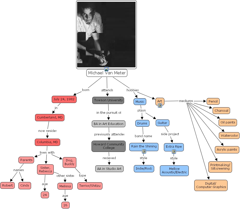 vanmeter, printmaking silkcreening, guitar, howard community college, terrior shitzu, ba in art education, oil paints, robert, cindy, music, cumberland, md, charcoal, dog, buddy, pencil, michael van meter, art, towson university, columbia, md, 24, sister, rebecca, mellow acoustic electric, , acrylic paints, july 24, 1982, parents, aa in studio art, rain the shining, drums, melissa, 26, digital computer graphics, extra ripe, indie rock, watercolor