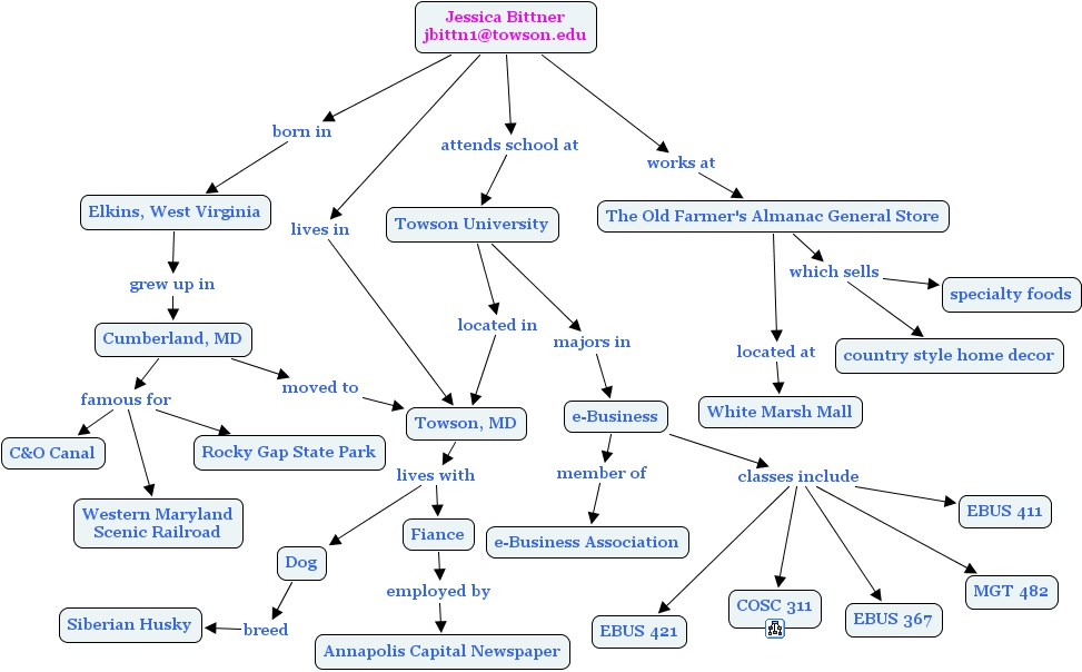 Jessica Bittner jbittn1@towson.edu born in Elkins, West Virginia, Jessica Bittner jbittn1@towson.edu attends school at Towson University, Fiance employed by Annapolis Capital Newspaper, Jessica Bittner jbittn1@towson.edu works at The Old Farmer's Almanac General Store, Towson University majors in e-Business, The Old Farmer's Almanac General Store located at White Marsh Mall, Towson University located in Towson, MD, Dog breed Siberian Husky, Towson, MD lives with Dog, Towson, MD lives with Fiance, The Old Farmer's Almanac General Store which sells specialty foods, The Old Farmer's Almanac General Store which sells country style home decor, Cumberland, MD famous for Rocky Gap State Park, Cumberland, MD famous for Western Maryland Scenic Railroad, Cumberland, MD famous for C&O Canal, e-Business member of e-Business Association, Cumberland, MD moved to Towson, MD, e-Business classes include COSC 311, e-Business classes include MGT 482, e-Business classes include EBUS 421, e-Business classes include EBUS 367, e-Business classes include EBUS 411, Jessica Bittner jbittn1@towson.edu lives in Towson, MD, Elkins, West Virginia grew up in Cumberland, MD