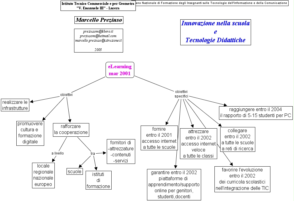 eLearning mar 2001 obiettivi specifici collegare entro il 2002 a tutte le scuole a reti di ricerca, eLearning mar 2001 obiettivi specifici favorire l'evoluzione entro il 2002 dei curricola scolastici nell'integrazione delle TIC, eLearning mar 2001 obiettivi specifici garantire entro il 2002 piattaforme di apprendimento/supporto online per genitori, studenti,docenti, eLearning mar 2001 obiettivi specifici fornire entro il 2001 accesso internet a tutte le scuole, eLearning mar 2001 obiettivi specifici raggiungere entro il 2004 il rapporto di 5-15 studenti per PC, eLearning mar 2001 obiettivi specifici attrezzare entro il 2002 accesso internet veloce a tutte le classi, rafforzare la cooperazione a livello locale regionale nazionale europeo, eLearning mar 2001 obiettivi rafforzare la cooperazione, eLearning mar 2001 obiettivi promuovere cultura e formazione digitale, eLearning mar 2001 obiettivi realizzare le infrastrutture, rafforzare la cooperazione tra scuole, rafforzare la cooperazione tra istituti di formazione, rafforzare la cooperazione tra fornitori di -attrezzature -contenuti -servizi