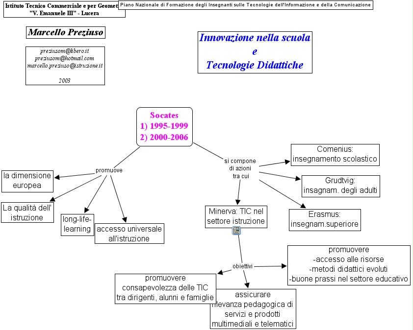 Minerva: TIC nel settore istruzione obiettivi promuovere -accesso alle risorse -metodi didattici evoluti -buone prassi nel settore educativo, Minerva: TIC nel settore istruzione obiettivi promuovere consapevolezza delle TIC tra dirigenti, alunni e famiglie, Minerva: TIC nel settore istruzione obiettivi assicurare rilevanza pedagogica di servizi e prodotti multimediali e telematici, Socates 1) 1995-1999 2) 2000-2006 si compone di azioni tra cui Minerva: TIC nel settore istruzione, Socates 1) 1995-1999 2) 2000-2006 si compone di azioni tra cui Grudtvig: insagnam. degli adulti, Socates 1) 1995-1999 2) 2000-2006 si compone di azioni tra cui Comenius: insegnamento scolastico, Socates 1) 1995-1999 2) 2000-2006 si compone di azioni tra cui Erasmus: insegnam.superiore, Socates 1) 1995-1999 2) 2000-2006 promuove La qualit� dell' istruzione, Socates 1) 1995-1999 2) 2000-2006 promuove la dimensione europea, Socates 1) 1995-1999 2) 2000-2006 promuove long-life- learning, Socates 1) 1995-1999 2) 2000-2006 promuove accesso universale all'istruzione