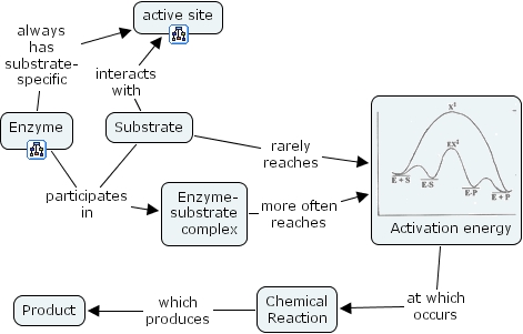 Substrate participates in Enzyme- substrate complex, Substrate interacts with active site, Enzyme participates in Enzyme- substrate complex, Enzyme always has substrate- specific active site, Substrate rarely reaches Activation energy, Chemical Reaction which produces Product, Activation energy at which occurs Chemical Reaction, Enzyme- substrate complex more often reaches Activation energy