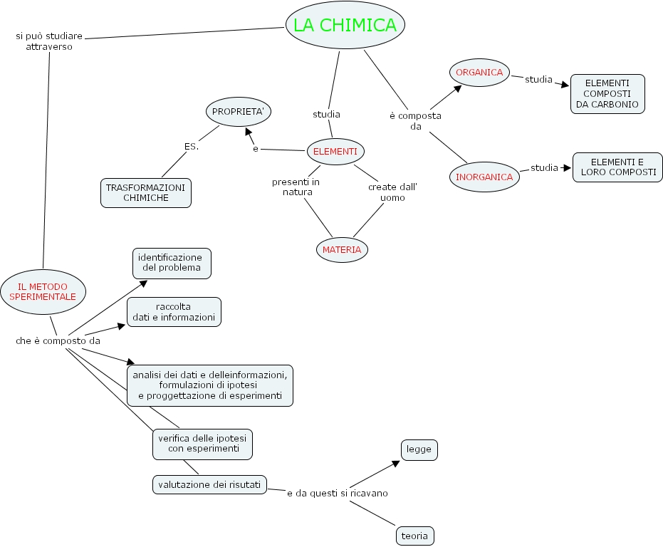 LA CHIMICA � composta da ORGANICA, LA CHIMICA � composta da INORGANICA, IL METODO SPERIMENTALE che � composto da analisi dei dati e delleinformazioni, formulazioni di ipotesi e proggettazione di esperimenti, IL METODO SPERIMENTALE che � composto da raccolta dati e informazioni, IL METODO SPERIMENTALE che � composto da verifica delle ipotesi con esperimenti, IL METODO SPERIMENTALE che � composto da identificazione del problema, IL METODO SPERIMENTALE che � composto da valutazione dei risutati, PROPRIETA' ES. TRASFORMAZIONI CHIMICHE, ELEMENTI presenti in natura MATERIA, LA CHIMICA studia ELEMENTI, ELEMENTI e PROPRIETA', LA CHIMICA si pu� studiare attraverso IL METODO SPERIMENTALE, ELEMENTI create dall' uomo MATERIA, valutazione dei risutati e da questi si ricavano teoria, valutazione dei risutati e da questi si ricavano legge, ORGANICA studia ELEMENTI COMPOSTI DA CARBONIO, INORGANICA studia ELEMENTI E LORO COMPOSTI
