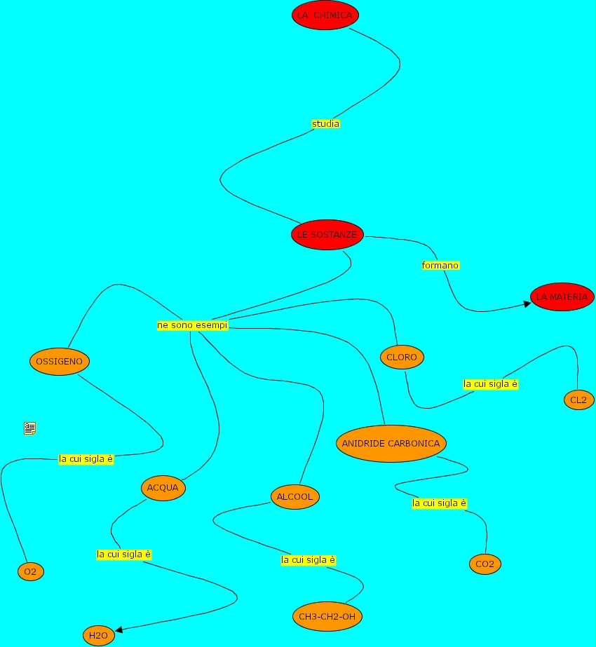 ACQUA la cui sigla � H2O, OSSIGENO la cui sigla � O2, CLORO la cui sigla � CL2, ANIDRIDE CARBONICA la cui sigla � CO2, LE SOSTANZE ne sono esempi ALCOOL, LE SOSTANZE ne sono esempi ANIDRIDE CARBONICA, LE SOSTANZE ne sono esempi CLORO, LE SOSTANZE ne sono esempi ACQUA, LE SOSTANZE ne sono esempi OSSIGENO, ALCOOL la cui sigla � CH3-CH2-OH, LA CHIMICA studia LE SOSTANZE, LE SOSTANZE formano LA MATERIA
