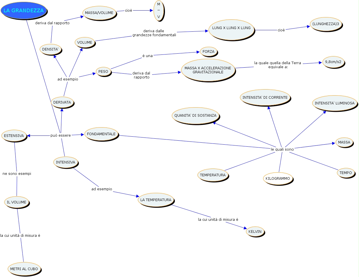 DENSITA' deriva dal rapporto MASSA/VOLUME, INTENSIVA ad esempio LA TEMPERATURA, ESTENSIVA ne sono esempi IL VOLUME, LUNG X LUNG X LUNG cio� (LUNGHEZZA)3, IL VOLUME la cui unit� di misura � METRI AL CUBO, VOLUME deriva dalle grandezze fondamentali LUNG X LUNG X LUNG , PESO � una FORZA, LA GRANDEZZA pu� essere FONDAMENTALE, LA GRANDEZZA pu� essere INTENSIVA, LA GRANDEZZA pu� essere ESTENSIVA, LA GRANDEZZA pu� essere DERIVATA, MASSA/VOLUME cio� M _ V, LA TEMPERATURA la cui unit� di misura � KELVIN, DERIVATA ad esempio DENSITA', DERIVATA ad esempio VOLUME, DERIVATA ad esempio PESO, FONDAMENTALE le quali sono TEMPO, FONDAMENTALE le quali sono INTENSITA' DI CORRENTE, FONDAMENTALE le quali sono QUANITA' DI SOSTANZA, FONDAMENTALE le quali sono KILOGRAMMO, FONDAMENTALE le quali sono INTENSITA' LUMINOSA, FONDAMENTALE le quali sono MASSA, FONDAMENTALE le quali sono TEMPERATURA, MASSA X ACCELERAZIONE GRAVITAZIONALE la quale quella della Terra equivale a: 9,8cm/s2, PESO deriva dal rapporto MASSA X ACCELERAZIONE GRAVITAZIONALE