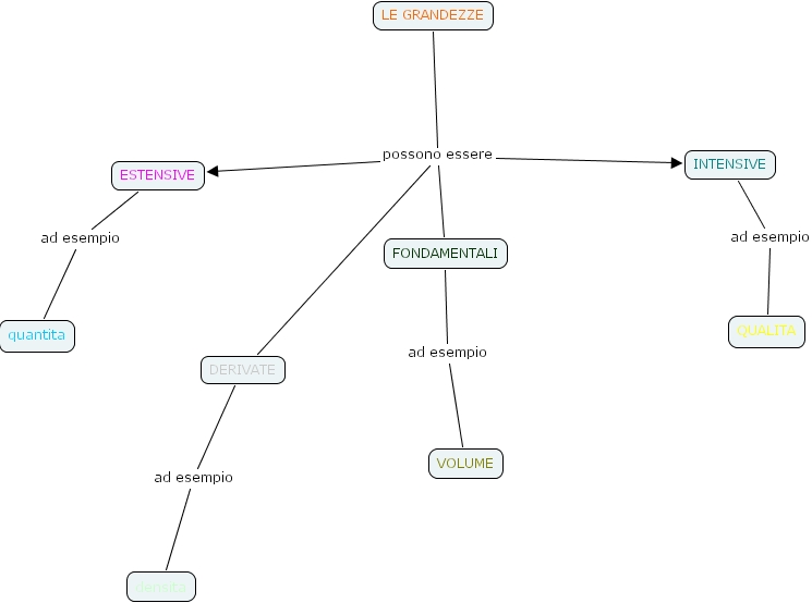 INTENSIVE ad esempio QUALITA, DERIVATE ad esempio densita, FONDAMENTALI ad esempio VOLUME, ESTENSIVE ad esempio quantita, LE GRANDEZZE possono essere DERIVATE, LE GRANDEZZE possono essere INTENSIVE, LE GRANDEZZE possono essere ESTENSIVE, LE GRANDEZZE possono essere FONDAMENTALI