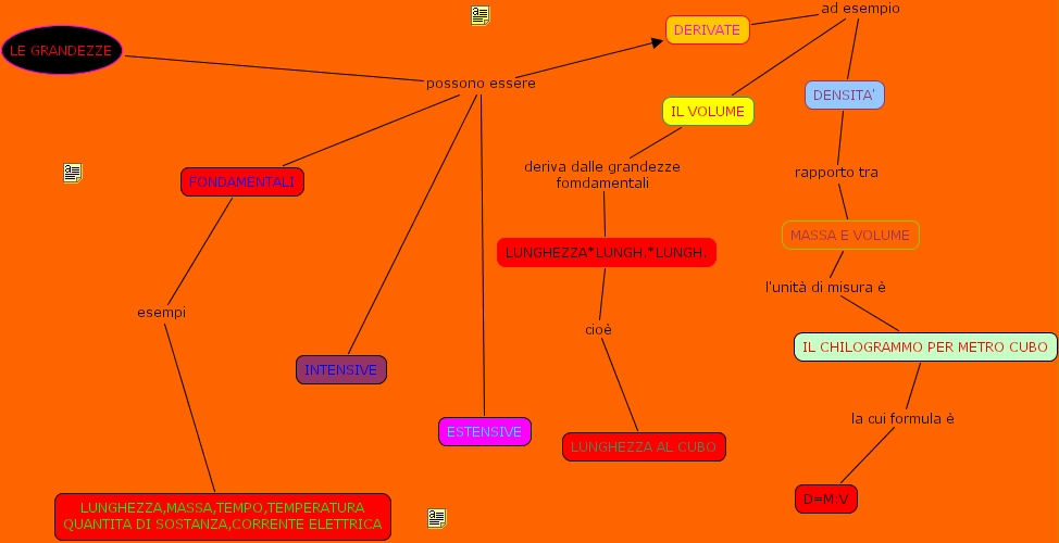 IL CHILOGRAMMO PER METRO CUBO la cui formula � D=M:V, IL VOLUME deriva dalle grandezze fomdamentali LUNGHEZZA*LUNGH.*LUNGH., LE GRANDEZZE possono essere ESTENSIVE, LE GRANDEZZE possono essere FONDAMENTALI, LE GRANDEZZE possono essere DERIVATE, LE GRANDEZZE possono essere INTENSIVE, FONDAMENTALI esempi LUNGHEZZA,MASSA,TEMPO,TEMPERATURA QUANTITA DI SOSTANZA,CORRENTE ELETTRICA, MASSA E VOLUME l'unit� di misura � IL CHILOGRAMMO PER METRO CUBO, DERIVATE ad esempio IL VOLUME, DERIVATE ad esempio DENSITA', DENSITA' rapporto tra MASSA E VOLUME, LUNGHEZZA*LUNGH.*LUNGH. cio� LUNGHEZZA AL CUBO