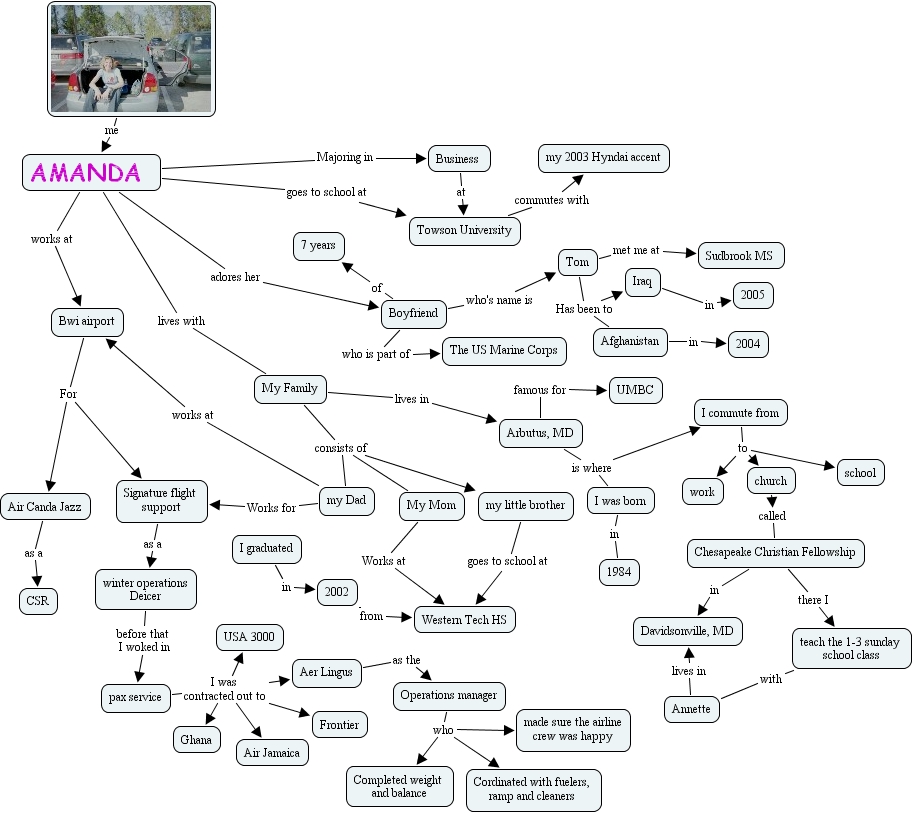 teach the 1-3 sunday school class with Annette, pax service I was contracted out to Ghana, pax service I was contracted out to Air Jamaica, pax service I was contracted out to Aer Lingus, pax service I was contracted out to Frontier, pax service I was contracted out to USA 3000, Signature flight support as a winter operations Deicer, church called Chesapeake Christian Fellowship, I commute from to school, I commute from to church, I commute from to work, me AMANDA , My Family lives in Arbutus, MD, Afghanistan in 2004, Business at Towson University, Tom Has been to Iraq, Tom Has been to Afghanistan, my Dad Works for Signature flight support, my Dad works at Bwi airport, Arbutus, MD famous for UMBC, My Family consists of my Dad, My Family consists of my little brother, My Family consists of My Mom, Air Canda Jazz as a CSR, Bwi airport For Air Canda Jazz, Bwi airport For Signature flight support, winter operations Deicer before that I woked in pax service, Aer Lingus as the Operations manager, Boyfriend who's name is Tom, 2002 from Western Tech HS, my little brother goes to school at Western Tech HS, Chesapeake Christian Fellowship in Davidsonville, MD, Boyfriend who is part of The US Marine Corps, Boyfriend of 7 years, AMANDA Majoring in Business , Operations manager who Cordinated with fuelers, ramp and cleaners , Operations manager who Completed weight and balance, Operations manager who made sure the airline crew was happy, AMANDA adores her Boyfriend, Chesapeake Christian Fellowship there I teach the 1-3 sunday school class, Annette lives in Davidsonville, MD, Towson University commutes with my 2003 Hyndai accent, I was born in 1984, AMANDA goes to school at Towson University, Iraq in 2005, Arbutus, MD is where I commute from, Arbutus, MD is where I was born, My Mom Works at Western Tech HS, Tom met me at Sudbrook MS , AMANDA works at Bwi airport, I graduated in 2002