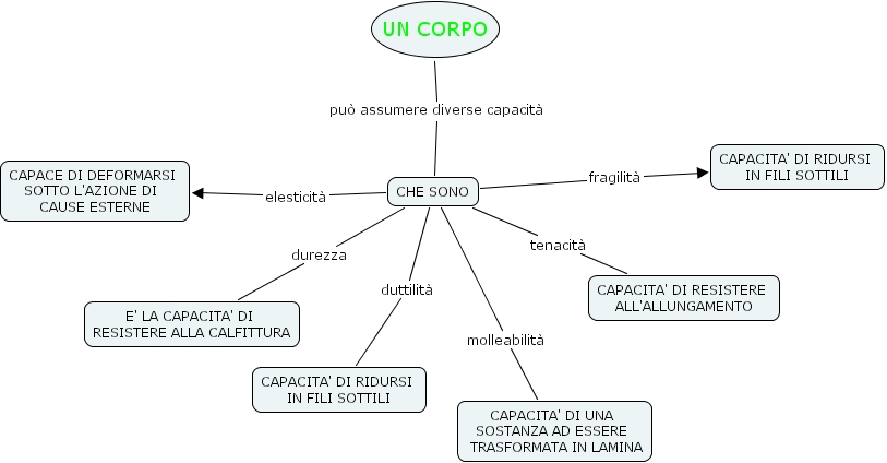 CHE SONO tenacit� CAPACITA' DI RESISTERE ALL'ALLUNGAMENTO, CHE SONO duttilit� CAPACITA' DI RIDURSI IN FILI SOTTILI, CHE SONO fragilit� CAPACITA' DI RIDURSI IN FILI SOTTILI, CHE SONO molleabilit� CAPACITA' DI UNA SOSTANZA AD ESSERE TRASFORMATA IN LAMINA, UN CORPO pu� assumere diverse capacit� CHE SONO, CHE SONO elesticit� CAPACE DI DEFORMARSI SOTTO L'AZIONE DI CAUSE ESTERNE, CHE SONO durezza E' LA CAPACITA' DI RESISTERE ALLA CALFITTURA