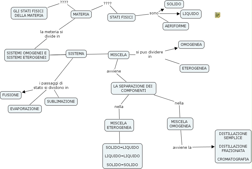 SISTEMI OMOGENEI E SISTEMI ETEROGENEI ???? SISTEMA, MISCELA si puo dividere in OMOGENEA, MISCELA si puo dividere in ETEROGENEA, STATI FISICI sono AERIFORME, STATI FISICI sono LIQUIDO, STATI FISICI sono SOLIDO, LA SEPARAZIONE DEI COMPONENTI nella MISCELA OMOGENEA, MISCELA avviene LA SEPARAZIONE DEI COMPONENTI, GLI STATI FISICI DELLA MATERIA ???? MATERIA, MATERIA la meteria si divide in SISTEMI OMOGENEI E SISTEMI ETEROGENEI, SISTEMA i passaggi di stato si dividono in FUSIONE, SISTEMA i passaggi di stato si dividono in SUBLIMAZIONE, SISTEMA i passaggi di stato si dividono in EVAPORAZIONE, LA SEPARAZIONE DEI COMPONENTI nella MISCELA ETEROGENEA, MATERIA ???? STATI FISICI, MISCELA OMOGENEA avviene la DISTILLAZIONE SEMPLICE DISTILLAZIONE FRAZIONATA CROMATOGRAFIA, SISTEMI OMOGENEI E SISTEMI ETEROGENEI ???? MISCELA, MISCELA ETEROGENEA ???? SOLIDO=LIQUIDO LIQUIDO=LIQUIDO SOLIDO=SOLIDO