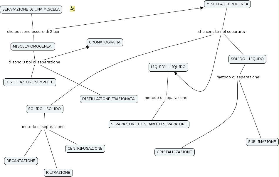 SEPARAZIONE DI UNA MISCELA che possono essere di 2 tipi MISCELA ETEROGENEA, SEPARAZIONE DI UNA MISCELA che possono essere di 2 tipi MISCELA OMOGENEA , MISCELA ETEROGENEA che consite nel separare: LIQUIDI - LIQUIDO, MISCELA ETEROGENEA che consite nel separare: SOLIDO - SOLIDO, MISCELA ETEROGENEA che consite nel separare: SOLIDO - LIQUDO, LIQUIDI - LIQUIDO metodo di separazione SEPARAZIONE CON IMBUTO SEPARATORE, SOLIDO - LIQUDO metodo di separazione CRISTALLIZAZIONE, SOLIDO - LIQUDO metodo di separazione SUBLIMAZIONE, MISCELA OMOGENEA ci sono 3 tipi di separazione CROMATOGRAFIA, MISCELA OMOGENEA ci sono 3 tipi di separazione DISTILLAZIONE FRAZIONATA , MISCELA OMOGENEA ci sono 3 tipi di separazione DISTILLAZIONE SEMPLICE, SOLIDO - SOLIDO metodo di separazione DECANTAZIONE, SOLIDO - SOLIDO metodo di separazione CENTRIFUGAZIONE, SOLIDO - SOLIDO metodo di separazione FILTRAZIONE