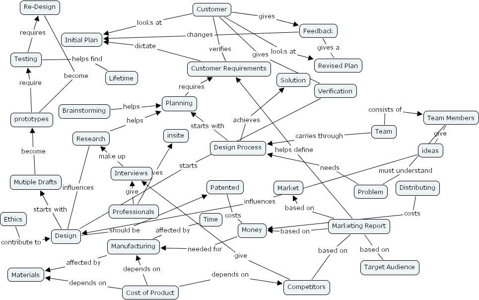 cmap 3, target audience, interviews, ideas, research, problem, re-design, ethics, team, manufacturing, insite, marketing report, customer, competitors, initial plan, lifetime, market, customer requirements, design process, time, cost of product, revised plan, team members, design, brainstorming, planning, materials, distributing, patented, mutiple drafts, verification, professionals, prototypes, solution, feedback, testing, money