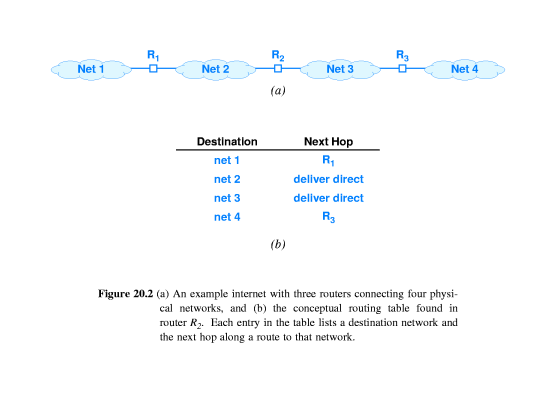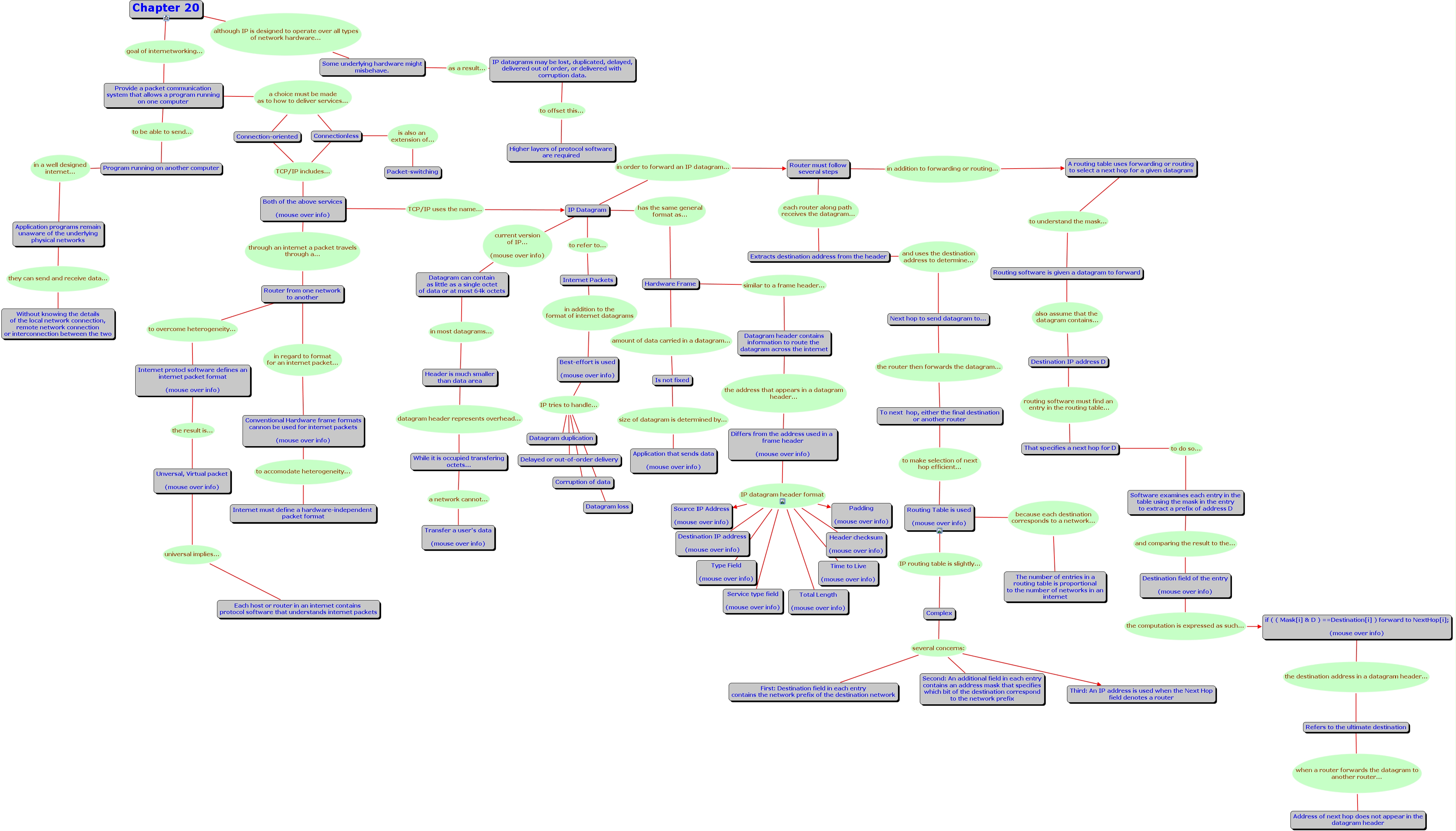 Software examines each entry in the table using the mask in the entry to extract a prefix of address D and comparing the result to the... Destination field of the entry (mouse over info), Routing Table is used (mouse over info) because each destination corresponds to a network... The number of entries in a routing table is proportional to the number of networks in an internet, While it is occupied transfering octets... a network cannot... Transfer a user's data (mouse over info), Hardware Frame similar to a frame header... Datagram header contains information to route the datagram across the internet, Conventional Hardware frame formats cannon be used for internet packets (mouse over info) to accomodate heterogeneity... Internet must define a hardware-independent packet format, Routing software is given a datagram to forward also assume that the datagram contains... Destination IP address D, Some underlying hardware might misbehave. as a result... IP datagrams may be lost, duplicated, delayed, delivered out of order, or delivered with corruption data., Differs from the address used in a frame header (mouse over info) IP datagram header format Destination IP address (mouse over info), Differs from the address used in a frame header (mouse over info) IP datagram header format Total Length (mouse over info), Differs from the address used in a frame header (mouse over info) IP datagram header format Service type field (mouse over info), Differs from the address used in a frame header (mouse over info) IP datagram header format Header checksum (mouse over info), Differs from the address used in a frame header (mouse over info) IP datagram header format Type Field (mouse over info), Differs from the address used in a frame header (mouse over info) IP datagram header format Time to Live (mouse over info), Differs from the address used in a frame header (mouse over info) IP datagram header format Source IP Address (mouse over info), Differs from the address used in a frame header (mouse over info) IP datagram header format Padding (mouse over info), Destination field of the entry (mouse over info) the computation is expressed as such... if ( ( Mask[i] & D ) ==Destination[i] ) forward to NextHop[i]; (mouse over info), Datagram can contain as little as a single octet of data or at most 64k octets in most datagrams... Header is much smaller than data area, Destination IP address D routing software must find an entry in the routing table... That specifies a next hop for D, Routing Table is used (mouse over info) IP routing table is slightly... Complex, Extracts destination address from the header and uses the destination address to determine... Next hop to send datagram to..., Both of the above services (mouse over info) through an internet a packet travels through a... Router from one network to another, That specifies a next hop for D to do so... Software examines each entry in the table using the mask in the entry to extract a prefix of address D, Datagram header contains information to route the datagram across the internet the address that appears in a datagram header... Differs from the address used in a frame header (mouse over info), Best-effort is used (mouse over info) IP tries to handle... Corruption of data, Best-effort is used (mouse over info) IP tries to handle... Delayed or out-of-order delivery, Best-effort is used (mouse over info) IP tries to handle... Datagram duplication, Best-effort is used (mouse over info) IP tries to handle... Datagram loss, Connection-oriented TCP/IP includes... Both of the above services (mouse over info), Provide a packet communication system that allows a program running on one computer to be able to send... Program running on another computer, Application programs remain unaware of the underlying physical networks they can send and receive data... Without knowing the details of the local network connection, remote network connection or interconnection between the two, Chapter 20 although IP is designed to operate over all types of network hardware... Some underlying hardware might misbehave., Router from one network to another to overcome heterogeneity... Internet protocl software defines an internet packet format (mouse over info), IP Datagram has the same general format as... Hardware Frame, Header is much smaller than data area datagram header represents overhead... While it is occupied transfering octets..., A routing table uses forwarding or routing to select a next hop for a given datagram to understand the mask... Routing software is given a datagram to forward, if ( ( Mask[i] & D ) ==Destination[i] ) forward to NextHop[i]; (mouse over info) the destination address in a datagram header... Refers to the ultimate destination, Router from one network to another in regard to format for an internet packet... Conventional Hardware frame formats cannon be used for internet packets (mouse over info), IP Datagram in order to forward an IP datagram... Router must follow several steps, Chapter 20 goal of internetworking... Provide a packet communication system that allows a program running on one computer, Refers to the ultimate destination when a router forwards the datagram to another router... Address of next hop does not appear in the datagram header, Complex several concerns: First: Destination field in each entry contains the network prefix of the destination network, Complex several concerns: Third: An IP address is used when the Next Hop field denotes a router, Complex several concerns: Second: An additional field in each entry contains an address mask that specifies which bit of the destination correspond to the network prefix, Unversal, Virtual packet (mouse over info) universal implies... Each host or router in an internet contains protocol software that understands internet packets, Internet Packets in addition to the format of internet datagrams Best-effort is used (mouse over info), IP Datagram to refer to... Internet Packets, Hardware Frame a