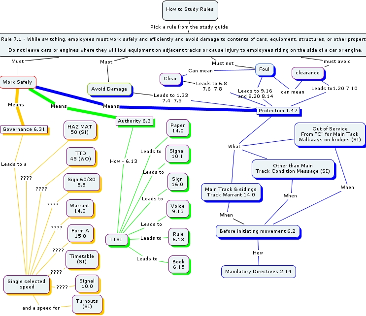 TTSI Leads to Paper 14.0, Before initiating movement 6.2 How Mandatory Directives 2.14, TTSI Leads to Sign 16.0, Other than Main Track Condition Message (SI) When Before initiating movement 6.2, Foul Can mean Clear, Single selected speed ???? Form A 15.0, clearance Leads to1.20 7.10 Protection 1.47, Single selected speed ???? HAZ MAT 50 (SI), Single selected speed ???? Warrant 14.0, Single selected speed and a speed for Turnouts (SI), Authority 6.3 How - 6.13 TTSI , TTSI Leads to Voice 9.15, TTSI Leads to Rule 6.13, Single selected speed ???? Sign 60/30 5.5, Governance 6.31 Leads to a Single selected speed, Rule 7.1 - While switching, employees must work safely and efficiently and avoid damage to contents of cars, equipment, structures, or other property. Do not leave cars or engines where they will foul equipment on adjacent tracks or cause injury to employees riding on the side of a car or engine. must avoid clearance, TTSI Leads to Book 6.15, Work Safely Means Protection 1.47, Avoid Damage Leads to 1.33 7.4 7.5 Protection 1.47, Main Track & sidings Track Warrant 14.0 When Before initiating movement 6.2, Clear Leads to 6.8 7.6 7.8 Protection 1.47, Rule 7.1 - While switching, employees must work safely and efficiently and avoid damage to contents of cars, equipment, structures, or other property. Do not leave cars or engines where they will foul equipment on adjacent tracks or cause injury to employees riding on the side of a car or engine. Must Avoid Damage, Foul Leads to 9.16 and 9.20 8.14 Protection 1.47, Work Safely Means Governance 6.31, How to Study Rules Pick a rule from the study guide Rule 7.1 - While switching, employees must work safely and efficiently and avoid damage to contents of cars, equipment, structures, or other property. Do not leave cars or engines where they will foul equipment on adjacent tracks or cause injury to employees riding on the side of a car or engine., Single selected speed ???? Timetable (SI), Foul can mean clearance, Single selected speed ???? TTD 45 (WO), Out of Service From "C" for Main Tack Walkways on bridges (SI) When Before initiating movement 6.2, Single selected speed ???? Signal 10.0, Work Safely Means Authority 6.3, TTSI Leads to Signal 10.1, Rule 7.1 - While switching, employees must work safely and efficiently and avoid damage to contents of cars, equipment, structures, or other property. Do not leave cars or engines where they will foul equipment on adjacent tracks or cause injury to employees riding on the side of a car or engine. Must not Foul, Protection 1.47 What Main Track & sidings Track Warrant 14.0, Protection 1.47 What Other than Main Track Condition Message (SI), Protection 1.47 What Out of Service From "C" for Main Tack Walkways on bridges (SI), Rule 7.1 - While switching, employees must work safely and efficiently and avoid damage to contents of cars, equipment, structures, or other property. Do not leave cars or engines where they will foul equipment on adjacent tracks or cause injury to employees riding on the side of a car or engine. Must Work Safely