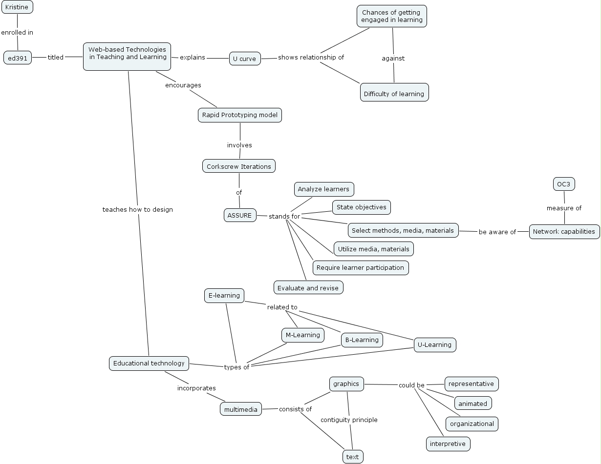 Kristine Hanson wk3, graphics could be interpretive, graphics could be animated, Web-based Technologies in Teaching and Learning teaches how to design Educational technology, graphics could be representative, OC3 measure of Network capabilities, B-Learning types of Educational technology, ASSURE stands for Require learner participation, ASSURE stands for Analyze learners, Rapid Prototyping model involves Corkscrew Iterations, E-learning types of Educational technology