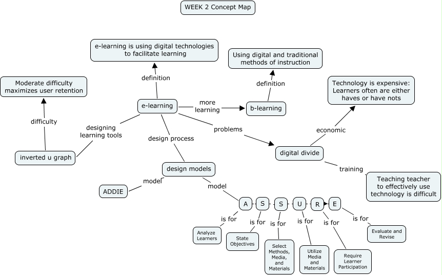 Adam Royalty wk2, e-learning definition e-learning is using digital technologies to facilitate learning, e-learning design process design models, e-learning more learning b-learning, inverted u graph difficulty Moderate difficulty maximizes user retention, design models model ADDIE, U E, e-learning problems digital divide, U R, b-learning definition Using digital and traditional methods of instruction, S is for State Objectives