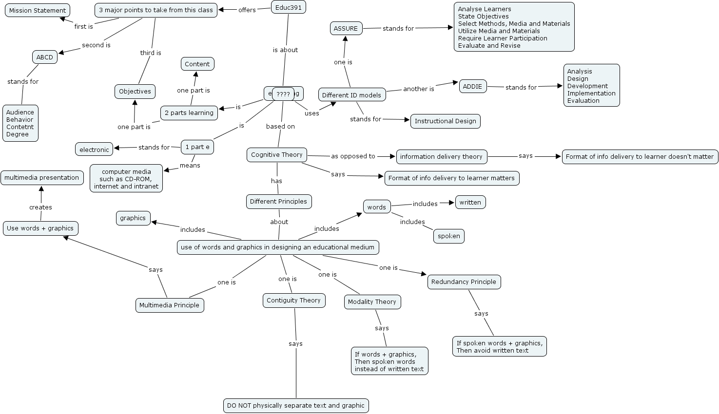 Sara Kalantari wk4, e-learning is 2 parts learning, 2 parts learning one part is Content, use of words and graphics in designing an educational medium includes words, ABCD stands for Audience Behavior Contetnt Degree, Different ID models one is ASSURE, ???? ???? ????, Use words + graphics creates multimedia presentation, Cognitive Theory says Format of info delivery to learner matters, 1 part e stands for electronic, Redundancy Principle says If spoken words + graphics, Then avoid written text