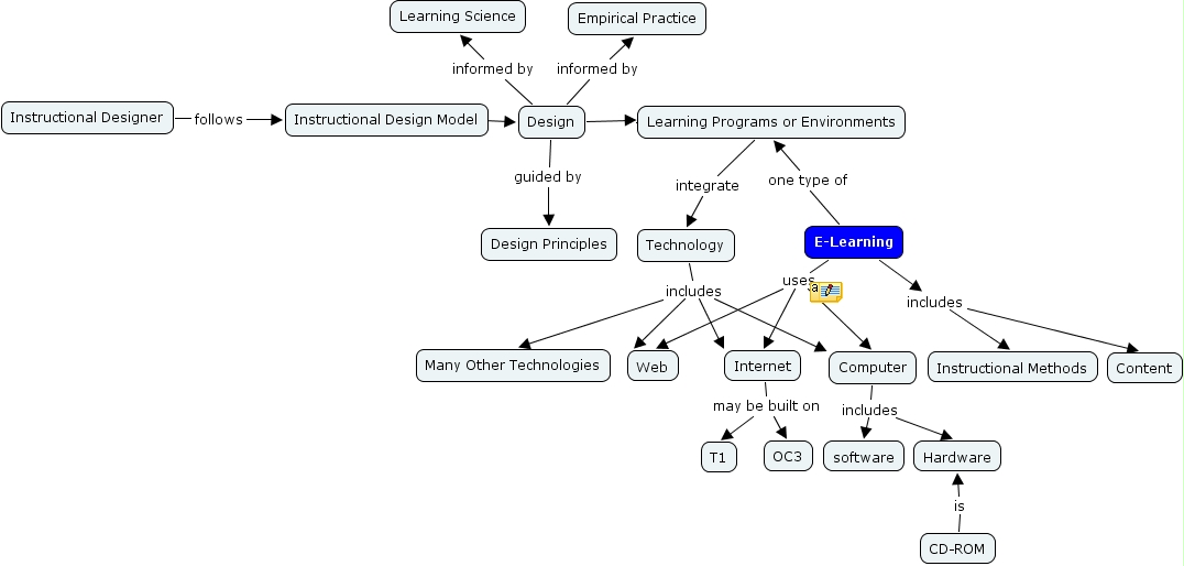Wuping Lu W4, Internet may be built on T1, Technology includes Internet, Technology includes Web, Computer includes software, E-Learning uses Internet, Instructional Design Model ???? Design, Design informed by Learning Science, Technology includes Many Other Technologies, Design guided by Design Principles, Design informed by Empirical Practice