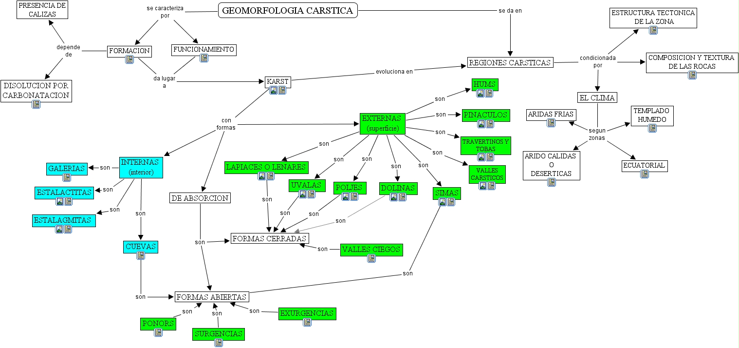 GEOMORFOLOGIA CARSTICA, INTERNAS (interior) son ESTALAGMITAS, PONORS son FORMAS ABIERTAS, EXURGENCIAS son FORMAS ABIERTAS, INTERNAS (interior) son GALERIAS, REGIONES CARSTICAS condicionada por COMPOSICION Y TEXTURA DE LAS ROCAS, DE ABSORCION son FORMAS ABIERTAS, EXTERNAS (superficie) son UVALAS, DE ABSORCION son FORMAS CERRADAS, KARST con formas DE ABSORCION, DOLINAS son FORMAS CERRADAS