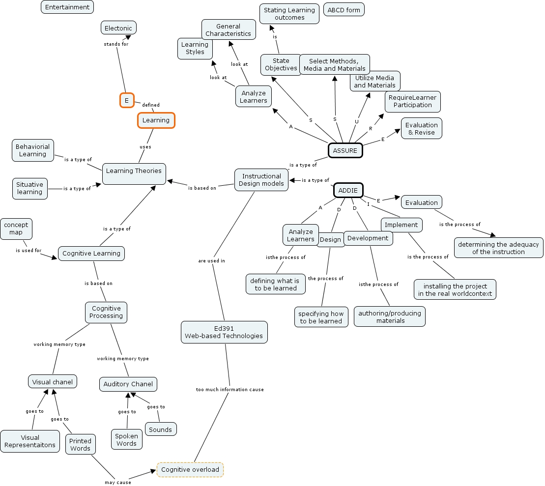 dahwunkim_wk4, ASSURE E Evaluation & Revise, ASSURE U Utilize Media and Materials, Analyze Learners look at General Characteristics, Situative learning is a type of Learning Theories, Sounds goes to Auditory Chanel, Spoken Words goes to Auditory Chanel, Design the process of specifying how to be learned, ADDIE I Implement, Analyze Learners isthe process of defining what is to be learned, State Objectives is Stating Learning outcomes