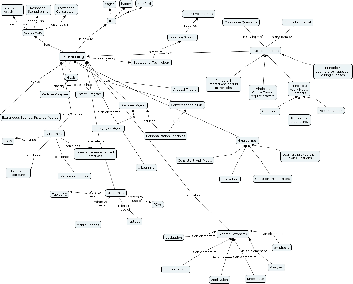 Sun-Young WK6, Bloom's Taxonomy facilitates E-Learning, Synthesis is an element of Bloom's Taxonomy, Principle 3 Apply Media Elements Practice Exercises, B-Learning combines knowledge management practices, Principle 1 Interactions should mirror jobs Practice Exercises, E-Learning avoids Extraneous Sounds, Pictures, Words, Classroom Questions in the form of Practice Exercises, Educational Technology is form of Learning Science, Practice Exercises ???? E-Learning, Personalization Principles includes Onscreen Agent