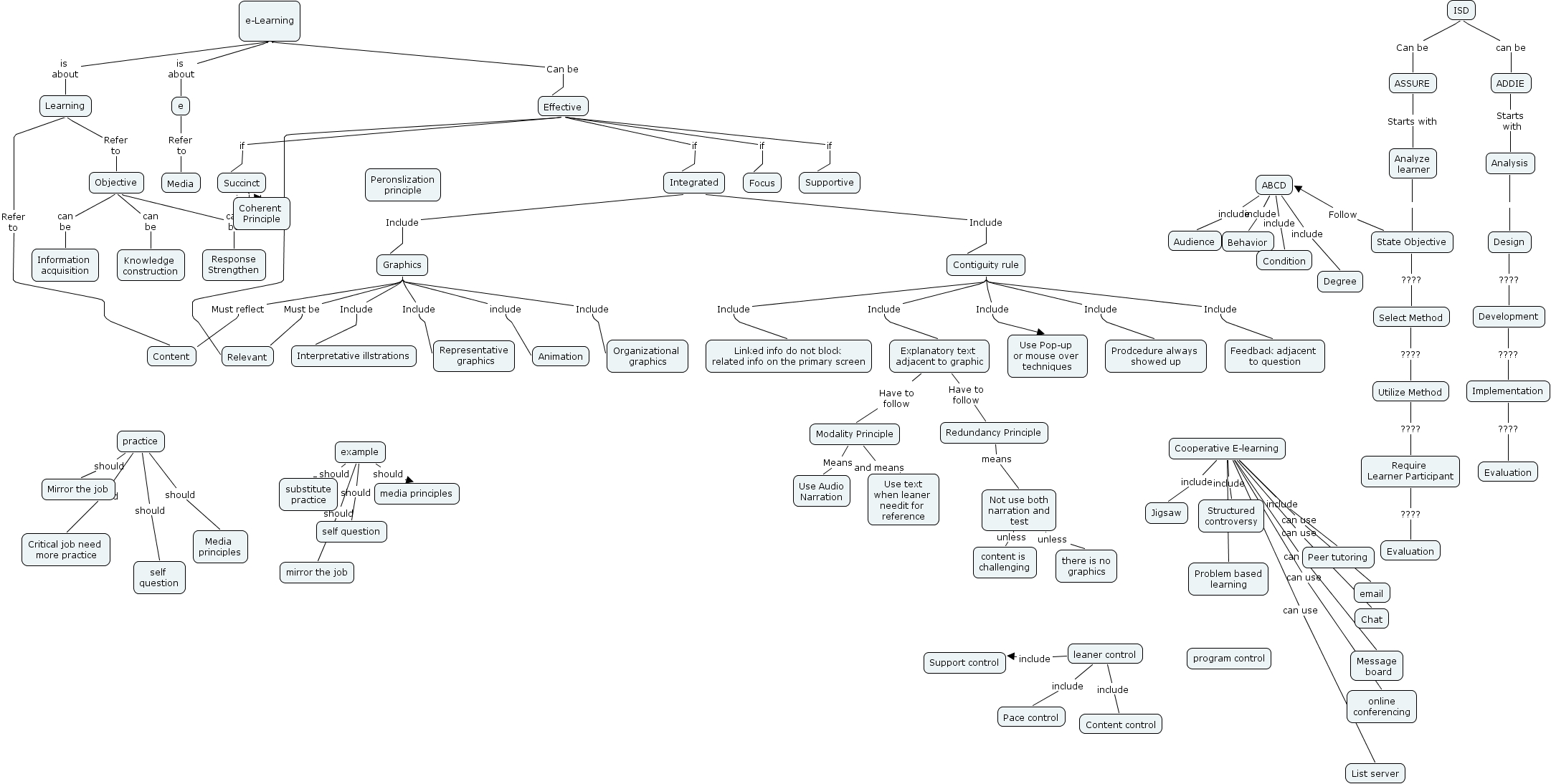 Jasper Pan W7, Not use both narration and test unless there is no graphics, Contiguity rule Include Use Pop-up or mouse over techniques, e-Learning is about e, Effective if Relevant, example should media principles, Implementation ???? Evaluation, e-Learning is about Learning, Learning Refer to Content, Graphics Include Interpretative illstrations, ISD can be ADDIE